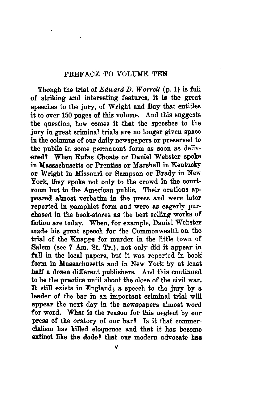The trial of Edward D. Worrell, detailed on page 1, is notable for its striking and interesting features. However, it is the compelling speeches to the jury by Wright and Bay that justify dedicating over 150 pages of this volume to the case. This raises the question: why are speeches to the jury in significant criminal trials no longer given space in the columns of our daily newspapers or preserved for the public in some permanent form immediately after delivery?