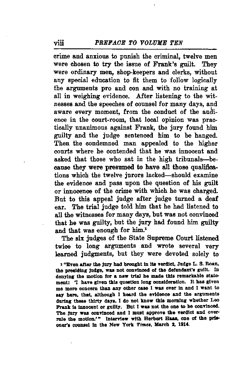 1 "Even after the jury had brought in its verdict, Judge L. S. Roan, the presiding judge, was not convinced of the defendant's guilt. In denying the motion for a new trial, he made this remarkable statement: 'I have given this question long consideration. It has given me more concern than any other case I was ever in, and I want to say here that, although I heard the evidence and the arguments during these thirty days, I do not know this morning whether Leo Frank is innocent or guilty. But I was not the one to be convinced. The jury was convinced, and I must approve the verdict and overrule the motion.'" Interview with Herbert Haas, one of the prisoner's counsel, in the New York Times, March 2, 1914.