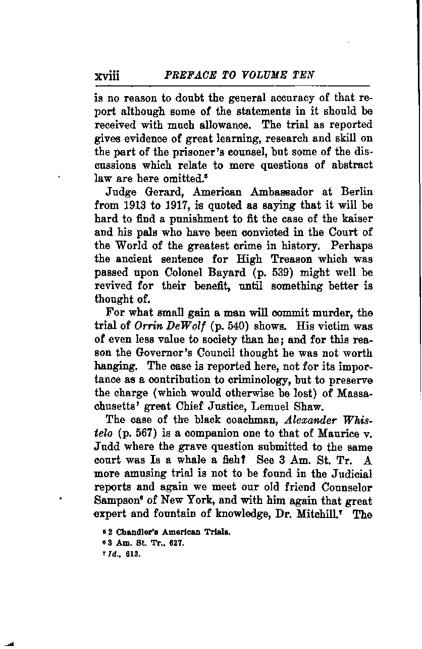 The trial of Orrin DeWolf (p. 540) shows for what small gain a man will commit murder. His victim was of even less value to society than he; and for this reason, the Governor's Council thought he was not worth hanging. The case is reported here, not for its importance as a contribution to criminology, but to preserve the charge (which would otherwise be lost) of Massachusetts' great Chief Justice, Lemuel Shaw.