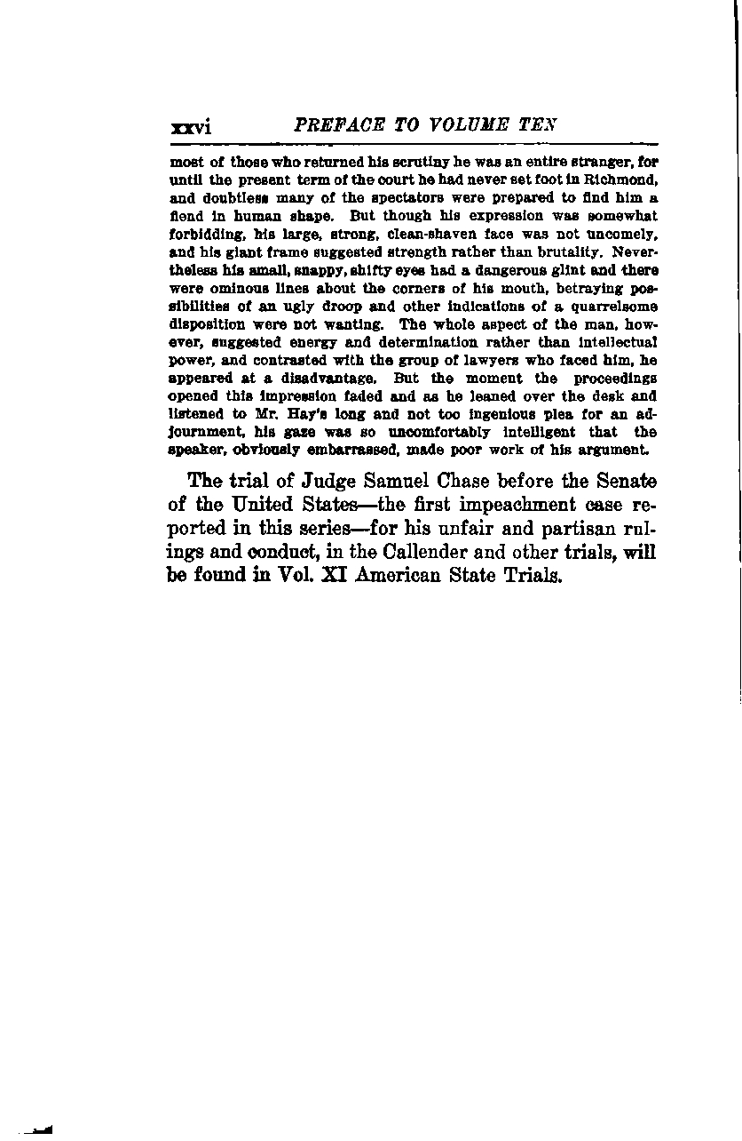 The trial of Judge Samuel Chase before the Senate of the United States—the first impeachment case reported in this series—for his unfair and partisan rulings and conduct, in the Callender and other trials, will be found in Volume XI of *American State Trials*.