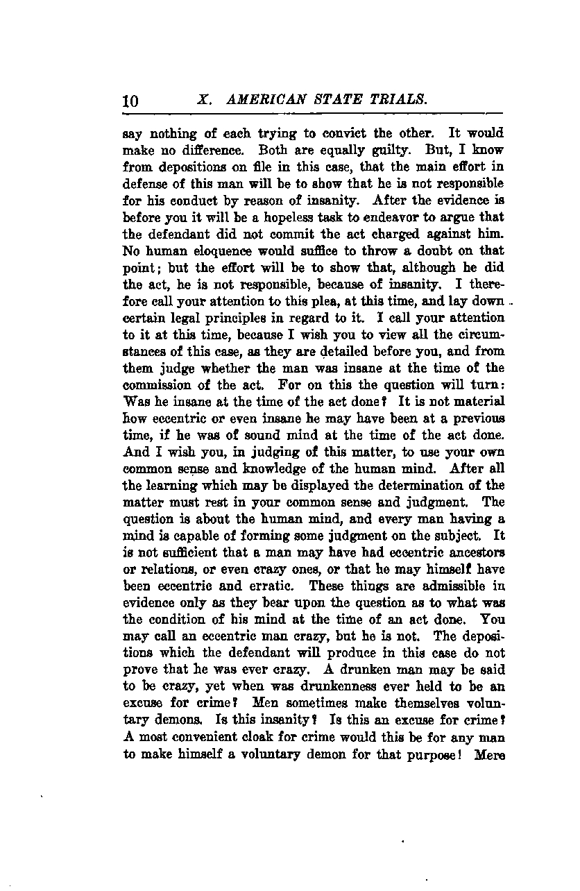 I wish you, in judging this matter, to use your own common sense and knowledge of the human mind. After all the learning that may be displayed, the determination of the matter must rest on your common sense and judgment. The question is about the human mind, and every man having a mind is capable of forming some judgment on the subject. It is not sufficient that a man may have had eccentric ancestors or relations, or even crazy ones, or that he may himself have been eccentric and erratic. These things are admissible in evidence only as they bear upon the question of what was the condition of his mind at the time of an act done. You may call an eccentric man crazy, but he is not. The depositions which the defendant will produce in this case do not prove that he was ever crazy. A drunken man may be said to be crazy, yet when was drunkenness ever held to be an excuse for crime? Men sometimes make themselves voluntary demons. Is this insanity? Is this an excuse for crime? A most convenient cloak for crime this would be for any man to make himself a voluntary demon for that purpose! Merely...