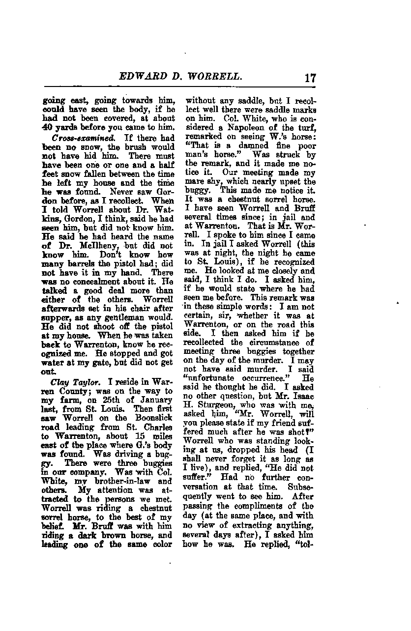 **Clay Taylor:** I reside in Warren County; I was on my way to my farm on the 25th of January last, from St. Louis. I first saw Worrell on the Boonville road leading from St. Charles to Warrenton, about 15 miles east of the place where G.’s body was found. I was driving a buggy. There were three buggies in our company. I was with Col. White, my brother-in-law, and others. My attention was attracted to the persons we met. Worrell was riding a chestnut sorrel horse, to the best of my belief. Mr. Bruff was with him, riding a dark brown horse, and leading one of the same color without any saddle, but I recollect well there were saddle marks on him. Col. White, who is considered a Napoleon of the turf, remarked on seeing W.’s horse: "That is a damned fine poor man’s horse." I was struck by the remark, and it made me notice it. Our meeting made my mare shy, which nearly upset the buggy. This made me notice it. It was a chestnut sorrel horse. I have seen Worrell and Bruff several times since; in jail and at Warrenton. That is Mr. Worrell. I spoke to him since I came in. In jail, I asked Worrell (this was at night, the night he came to St. Louis), if he recognized me. He looked at me closely and said, "I think I do." I asked him if he would state where he had seen me before. This remark was in these simple words: "I am not certain, sir, whether it was at Warrenton, or on the road this side." I then asked him if he recollected the circumstance of meeting three buggies together on the day of the murder. I may not have said murder. I said "unfortunate occurrence." He said he thought he did. I asked no other question, but Mr. Isaac H. Sturgeon, who was with me, asked him, "Mr. Worrell, will you please state if my friend suffered much after he was shot?" Worrell, who was standing looking at us, dropped his head (I shall never forget it as long as I live), and replied, "He did not suffer." We had no further conversation at that time. Subsequently, I went to see him. After passing the compliments of the day (at the same place, and with no view of extracting anything, several days after), I asked him how he was. He replied, "tolerable."