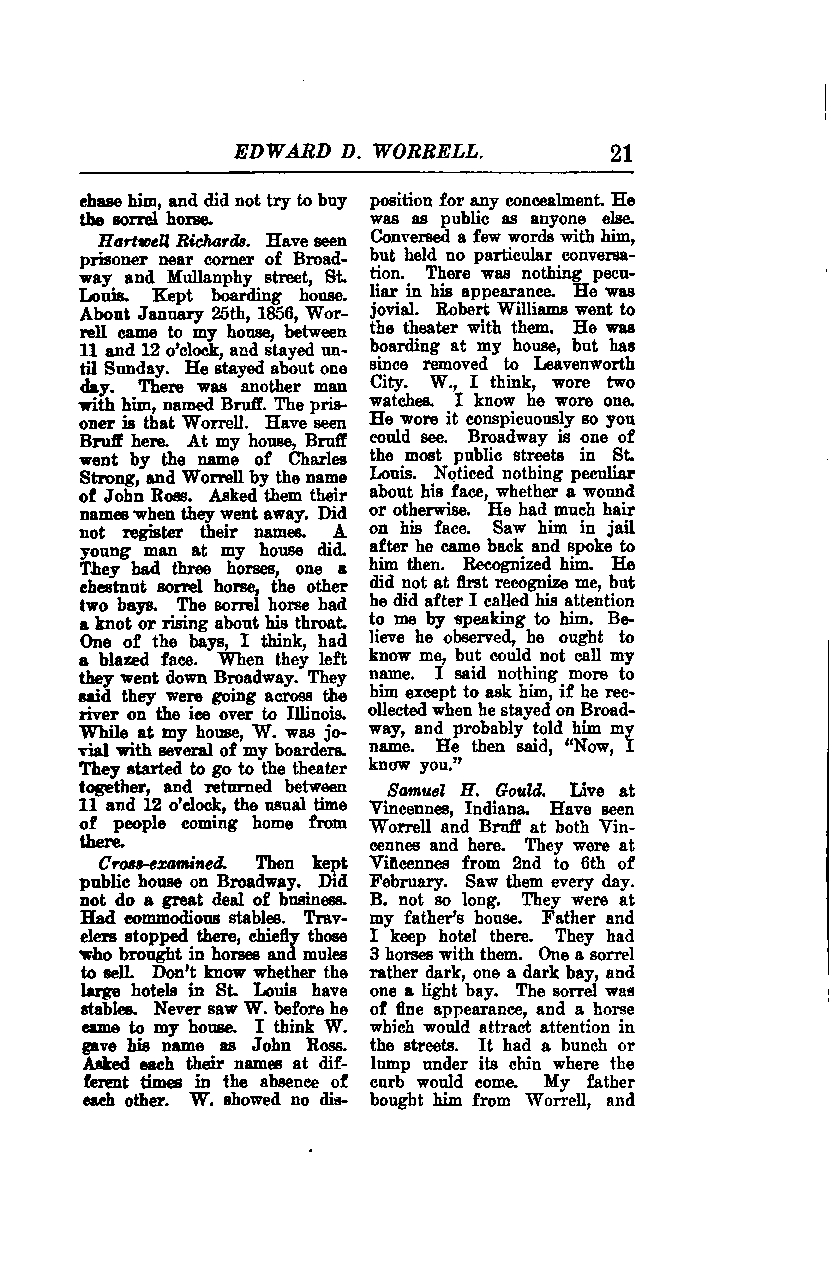 Samuel H. Gould, who lives in Vincennes, Indiana, testified that he had seen Worrell and Bruff at both Vincennes and here. They were in Vincennes from the 2nd to the 6th of February, and Gould saw them every day, though Bruff was not there as long. They stayed at Gould's father's house, where Gould and his father keep a hotel. They had three horses with them: one a rather dark sorrel, one a dark bay, and one a light bay. The sorrel was of fine appearance and would attract attention in the streets. It had a bunch or lump under its chin where the curb would come. Gould's father bought the sorrel from Worrell.