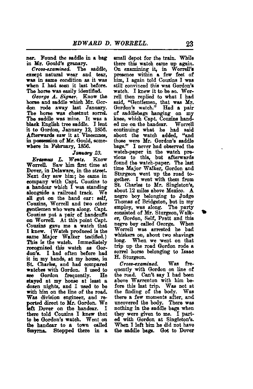**Erasmus L. Wents:** I know Worrell. I saw him for the first time at Dover, in Delaware, in the street. The next day, I saw him again; he came in company with Capt. Couzins to a handcar which I was standing alongside a railroad track. We all got on the handcar: myself, Couzins, Worrell, and two other gentlemen who were along. Capt. Couzins put a pair of handcuffs on Worrell. At this point, Capt. Couzins gave me a watch that I knew. (The watch produced is the same Major Walker testified about.) This is the watch. I immediately recognized this watch as Gordon’s. I had often had it in my hands at my house in St. Charles and had compared watches with Gordon. I used to see Gordon frequently. He stayed at my house at least a dozen nights, and I used to be with him on the line of the road. I was the division engineer and reported directly to Mr. Gordon. We left Dover on the handcar. I told Couzins there that I knew that to be Gordon’s watch. We went on the handcar to a town called Smyrna. We stopped there in a small depot for the train. While there, the watch came up again. On examining it in Worrell’s presence, within a few feet of him, I again told Couzins that I was still convinced this was Gordon's watch. I knew it to be so. Worrell then replied to what I had said, “Gentlemen, that was Mr. Gordon’s watch.” I had a pair of saddlebags hanging on my knee, which Capt. Couzins handed me on the handcar. Worrell, continuing what he had said about the watch, added, “and those were Mr. Gordon’s saddlebags.” I had never observed the watch-paper in the watch previous to this, but afterwards found the watch-paper. The last time Major Walker, Gordon, and Sturgeon went up the road together, I went with them from St. Charles to Mr. Singleton’s, about 12 miles above Mexico. A negro boy belonging to Judge Thomas of Bridgeton, but in my employ, was along. The party consisted of Mr. Sturgeon, Walker, Gordon, myself, Pratt, and this negro boy called George. When Worrell was arrested, he had whiskers on, about two shavings long. When we went on that trip up the road, Gordon rode a sorrel horse belonging to Isaac H. Sturgeon.