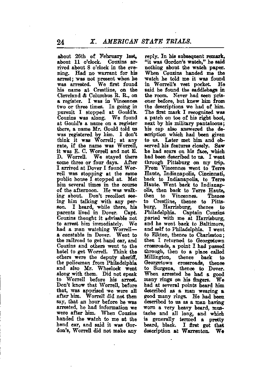On about the 26th of February last, around 11 o'clock, Couzins arrived about 8 o'clock in the evening. I had no warrant for his arrest and was not present when he was arrested. We first found his name at Crestline, on the Cleveland & Columbus Railroad, on a register. I was in Vincennes two or three times. In pursuit, I stopped at Gould's, and Couzins was along. We found a name on a register at Gould's, which Mr. Gould told us was registered by him. I don’t think it was Worrell; at any rate, if the name was Worrell, it was E. C. Worrell and not E. L. Worrell. We stayed there for about three or four days.
