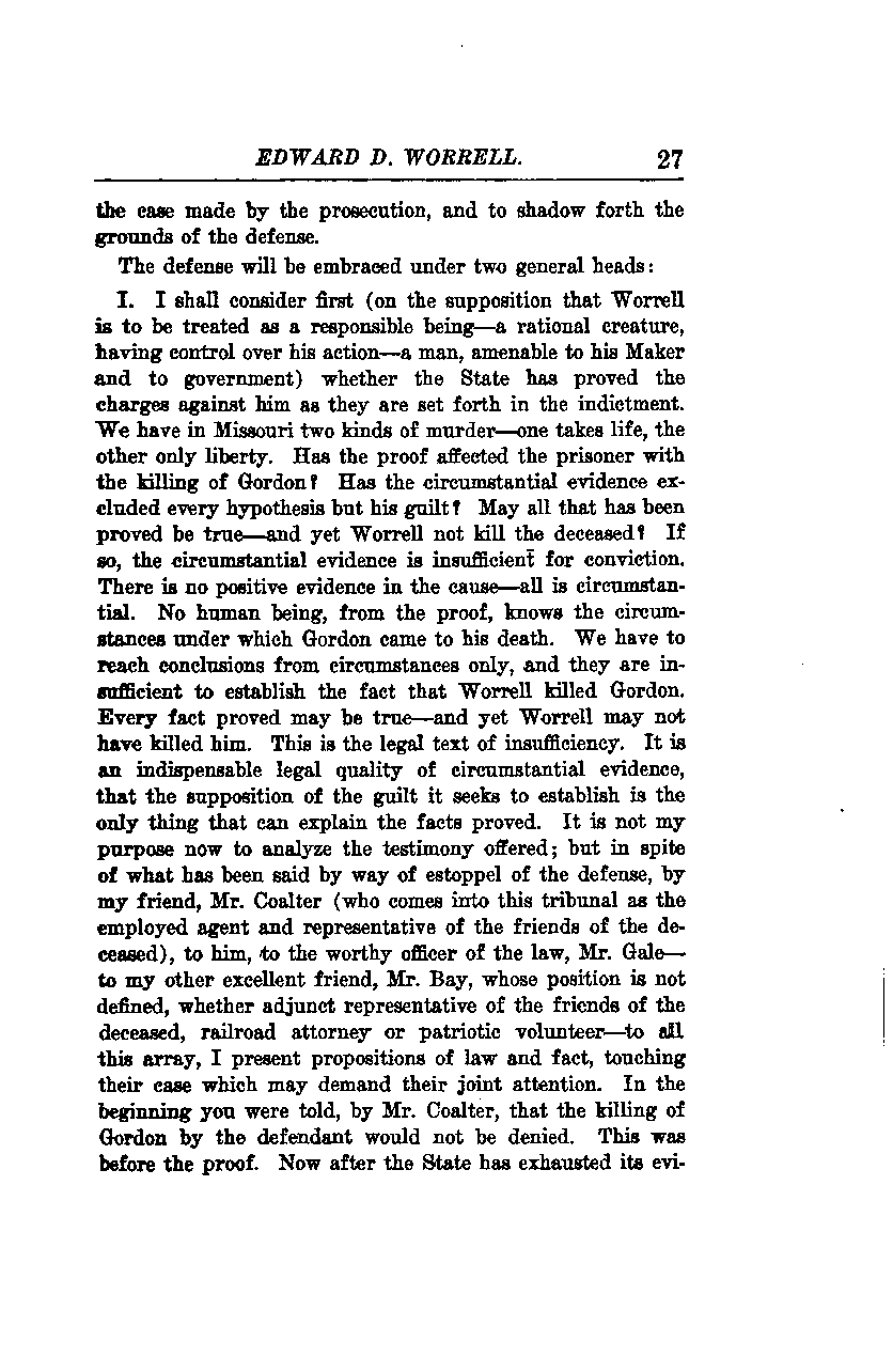 I. I shall first consider, on the supposition that Worrell is to be treated as a responsible being—a rational creature, having control over his actions—a man, amenable to his Maker and to government, whether the State has proven the charges against him as they are set forth in the indictment. In Missouri, we have two kinds of murder—one takes life, the other only liberty. Has the proof implicated the prisoner in the killing of Gordon? Has the circumstantial evidence excluded every hypothesis but his guilt? May all that has been proven be true—and yet Worrell not have killed the deceased? If so, the circumstantial evidence is insufficient for conviction. There is no positive evidence in the case—all is circumstantial. No human being, from the proof, knows the circumstances under which Gordon came to his death. We have to reach conclusions from circumstances only, and they are insufficient to establish the fact that Worrell killed Gordon. Every fact proven may be true—and yet Worrell may not have killed him. This is the legal test of insufficiency. It is an indispensable legal quality of circumstantial evidence that the supposition of the guilt it seeks to establish is the only thing that can explain the facts proven. It is not my purpose now to analyze the testimony offered; but in spite of what has been said by way of estoppel of the defense by my friend, Mr. Coalter (who comes into this tribunal as the employed agent and representative of the friends of the deceased), to him, to the worthy officer of the law, Mr. Gale—to my other excellent friend, Mr. Bay, whose position is not defined, whether adjunct representative of the friends of the deceased, railroad attorney, or patriotic volunteer—to all this array, I present propositions of law and fact, touching their case which may demand their joint attention. In the beginning, you were told by Mr. Coalter that the killing of Gordon by the defendant would not be denied. This was before the proof. Now, after the State has exhausted its evidence,
