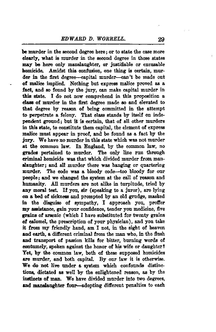 If you, sir (speaking to a juror), are lying on a bed of sickness and prompted by an old grudge, masked in the disguise of sympathy, I approach you, proffer my assistance, gain your confidence, tender you medicine—five grains of arsenic (which I have substituted for twenty grains of calomel, the prescription of your physician)—and you take it from my friendly hand, am I not, in the sight of heaven and earth, a different criminal from the man who, in the flush and transport of passion, kills for bitter, burning words of contumely, spoken against the honor of his wife or daughter? Yet, by the common law, both of these supposed homicides are murder, and both capital. By our law, it is otherwise.
