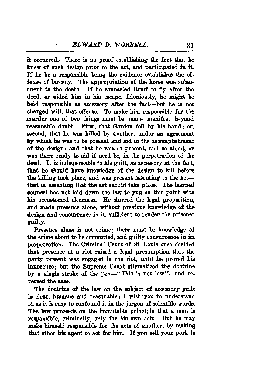 The doctrine of the law on the subject of accessory guilt is clear, humane, and reasonable; I wish you to understand it, as it is easy to confound it in the jargon of scientific words. The law proceeds on the immutable principle that a man is responsible, criminally, only for his own acts. But he may make himself responsible for the acts of another by making that other his agent to act for him. If you sell your pork to someone else...