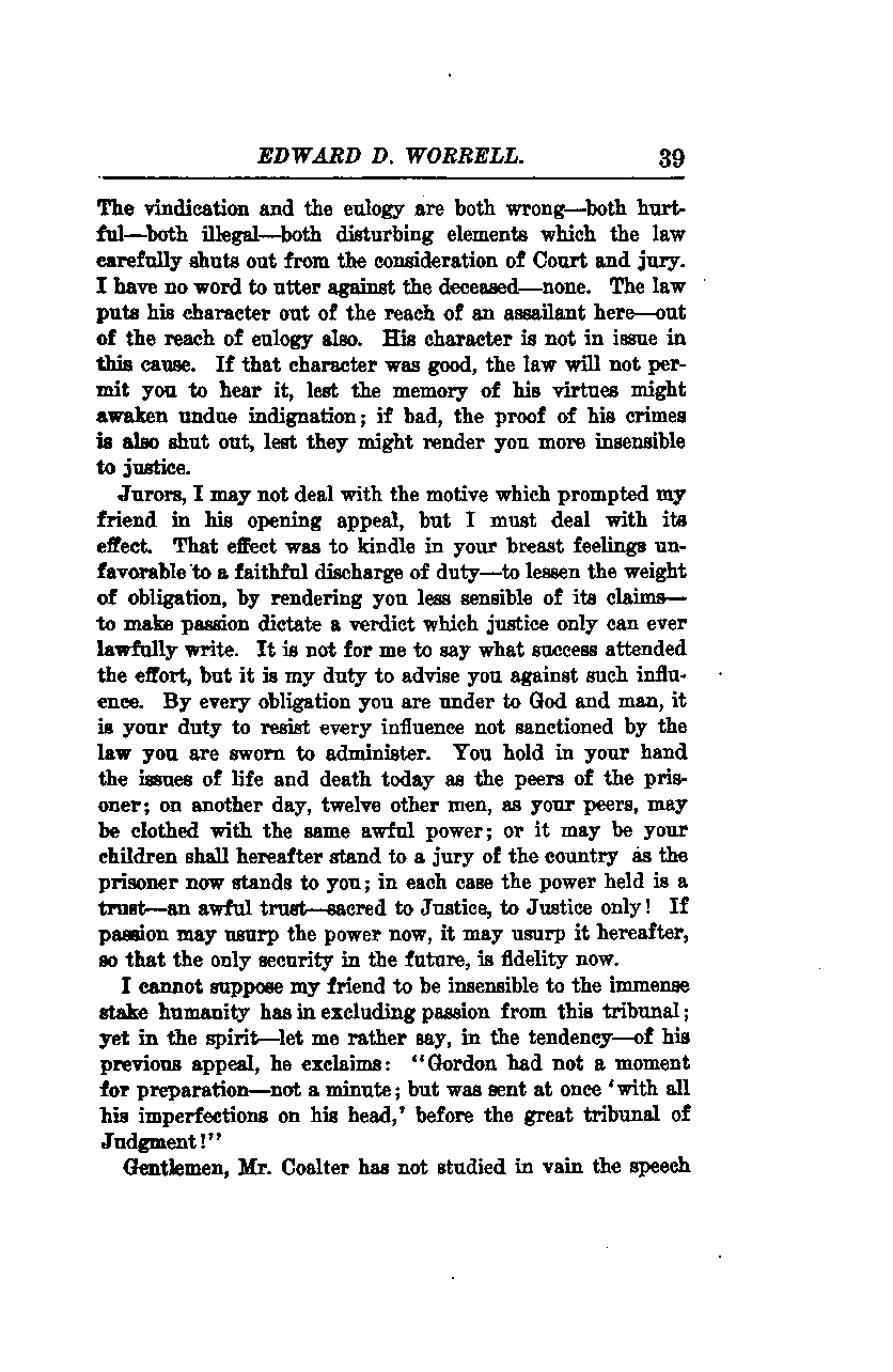 The vindication and the eulogy are both wrong—both hurtful—both illegal—both disturbing elements which the law carefully shuts out from the consideration of court and jury. I have no word to utter against the deceased—none. The law puts his character out of the reach of an assailant here—out of the reach of eulogy also. His character is not in issue in this cause. If that character was good, the law will not permit you to hear it, lest the memory of his virtues might awaken undue indignation; if bad, the proof of his crimes is also shut out, lest they might render you more insensible to justice.