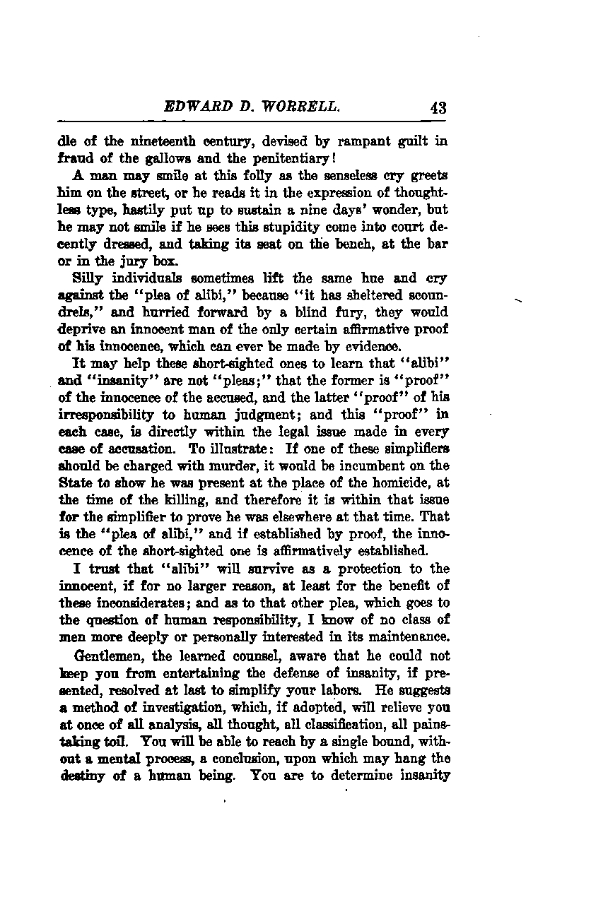 I trust that "alibi" will survive as a protection to the innocent, if for no larger reason, at least for the benefit of these inconsiderates. As to that other plea, which goes to the question of human responsibility, I know of no class of men more deeply or personally interested in its maintenance.
