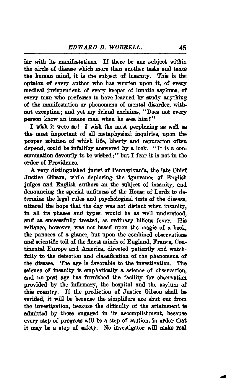 A very distinguished jurist of Pennsylvania, the late Chief Justice Gibson, while deploring the ignorance of English judges and English authors on the subject of insanity, and denouncing the special unfitness of the House of Lords to determine the legal rules and psychological tests of the disease, uttered the hope that the day was not distant when insanity, in all its phases and types, would be as well understood and as successfully treated as ordinary bilious fever. His reliance, however, was not based upon the magic of a book or the panacea of a glance, but upon the combined observations and scientific toil of the finest minds of England, France, Continental Europe, and America, directed patiently and watchfully to the detection and classification of the phenomena of the disease.