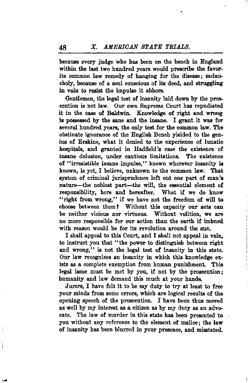Gentlemen, the legal test of insanity laid down by the prosecution is not law. Our own Supreme Court has repudiated it in the case of Baldwin. Knowledge of right and wrong is possessed by both the sane and the insane. I grant that for several hundred years, it was the only test for the common law. The obstinate ignorance of the English Bench yielded to the genius of Erskine, what it denied to the experience of lunatic hospitals, and granted in Hadfield's case the existence of insane delusion, under cautious limitations. The existence of "irresistible insane impulse," known wherever insanity is known, is yet, I believe, unknown to the common law. That system of criminal jurisprudence left out one part of man's nature—the noblest part—the will, the essential element of responsibility, here and hereafter. What if we do know "right from wrong," if we have not the freedom of will to choose between them? Without this capacity, our acts can be neither vicious nor virtuous. Without volition, we are no more responsible for our actions than the earth, if imbued with reason, would be for its revolution around the sun.