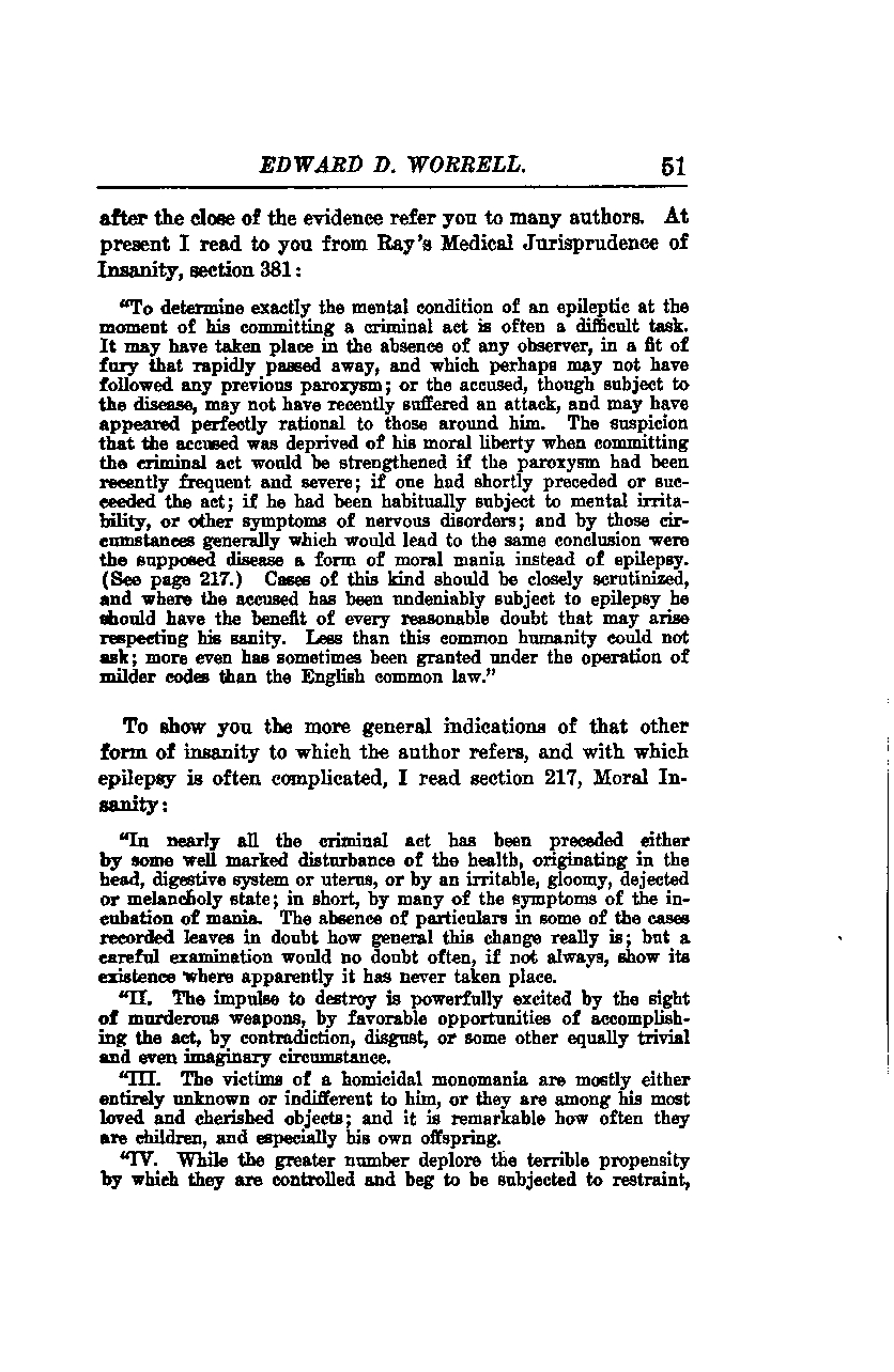 After the close of the evidence, I will refer you to many authors. At present, I read to you from Ray's Medical Jurisprudence of Insanity, section 381: