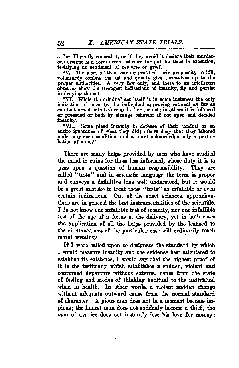 There are many helps provided by men who have studied the mind in ruins for those less informed, whose duty it is to pass upon a question of human responsibility. They are called "tests," and in scientific language, the term is proper and conveys a definitive idea well understood, but it would be a great mistake to treat these "tests" as infallible or even certain indications. Out of the exact sciences, approximations are in general the best instrumentalities of the scientific. I do not know one infallible test of insanity, nor one infallible test of the age of a fetus at delivery, yet in both cases, the application of all the helps provided by the learned to the circumstances of the particular case will ordinarily reach moral certainty.