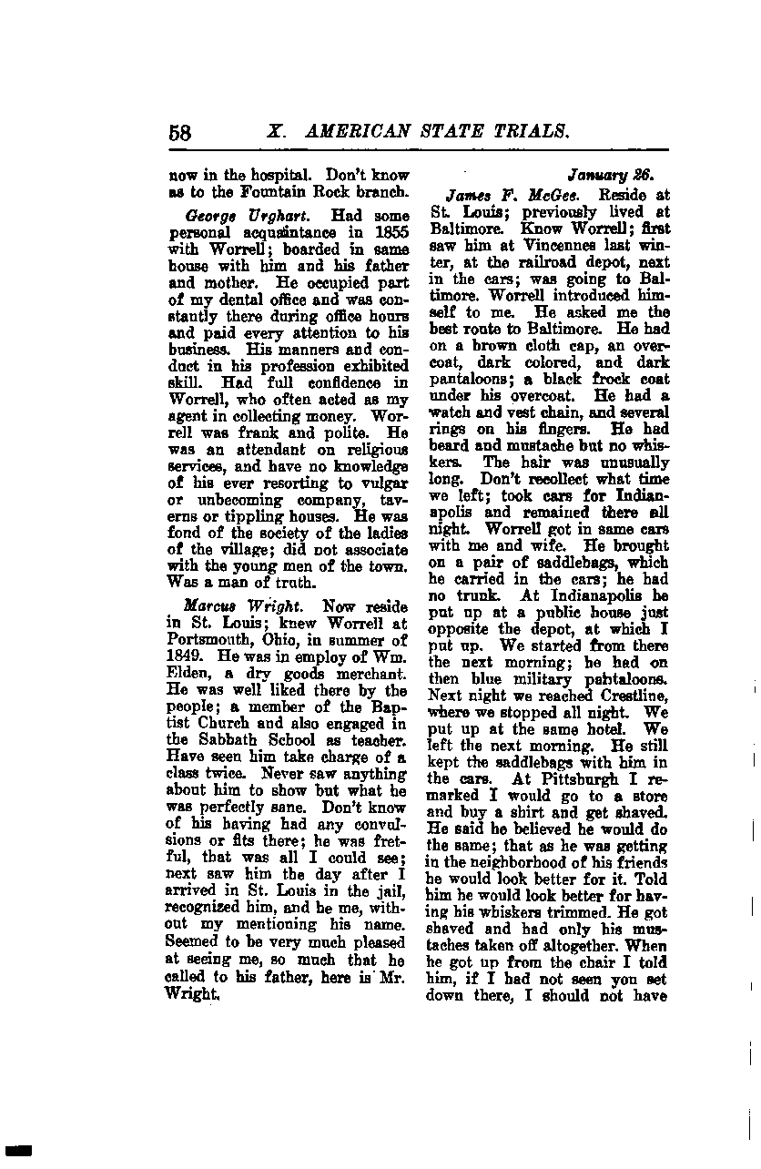 James F. McGee: I reside at St. Louis; previously, I lived at Baltimore. I know Worrell; I first saw him at Vincennes last winter, at the railroad depot, next in the cars; I was going to Baltimore. Worrell introduced himself to me. He asked me the best route to Baltimore. He had on a brown cloth cap, an overcoat, dark-colored, and dark pantaloons; a black frock coat under his overcoat. He had a watch and vest chain, and several rings on his fingers. He had a beard and mustache but no whiskers. His hair was unusually long. I don’t recollect what time we left; we took cars for Indianapolis and remained there all night. Worrell got in the same cars with me and my wife. He brought on a pair of saddlebags, which he carried in the cars; he had no trunk. At Indianapolis, he put up at a public house just opposite the depot, at which I put up. We started from there the next morning; he had on then blue military pantaloons. The next night we reached Crestline, where we stopped all night. We put up at the same hotel. We left the next morning. He still kept the saddlebags with him in the cars. At Pittsburgh, I remarked I would go to a store and buy a shirt and get shaved. He said he believed he would do the same; that as he was getting in the neighborhood of his friends, he would look better for it. I told him he would look better for having his whiskers trimmed. He got shaved and had only his mustaches taken off altogether. When he got up from the chair, I told him, "If I had not seen you sit down there, I should not have known you."