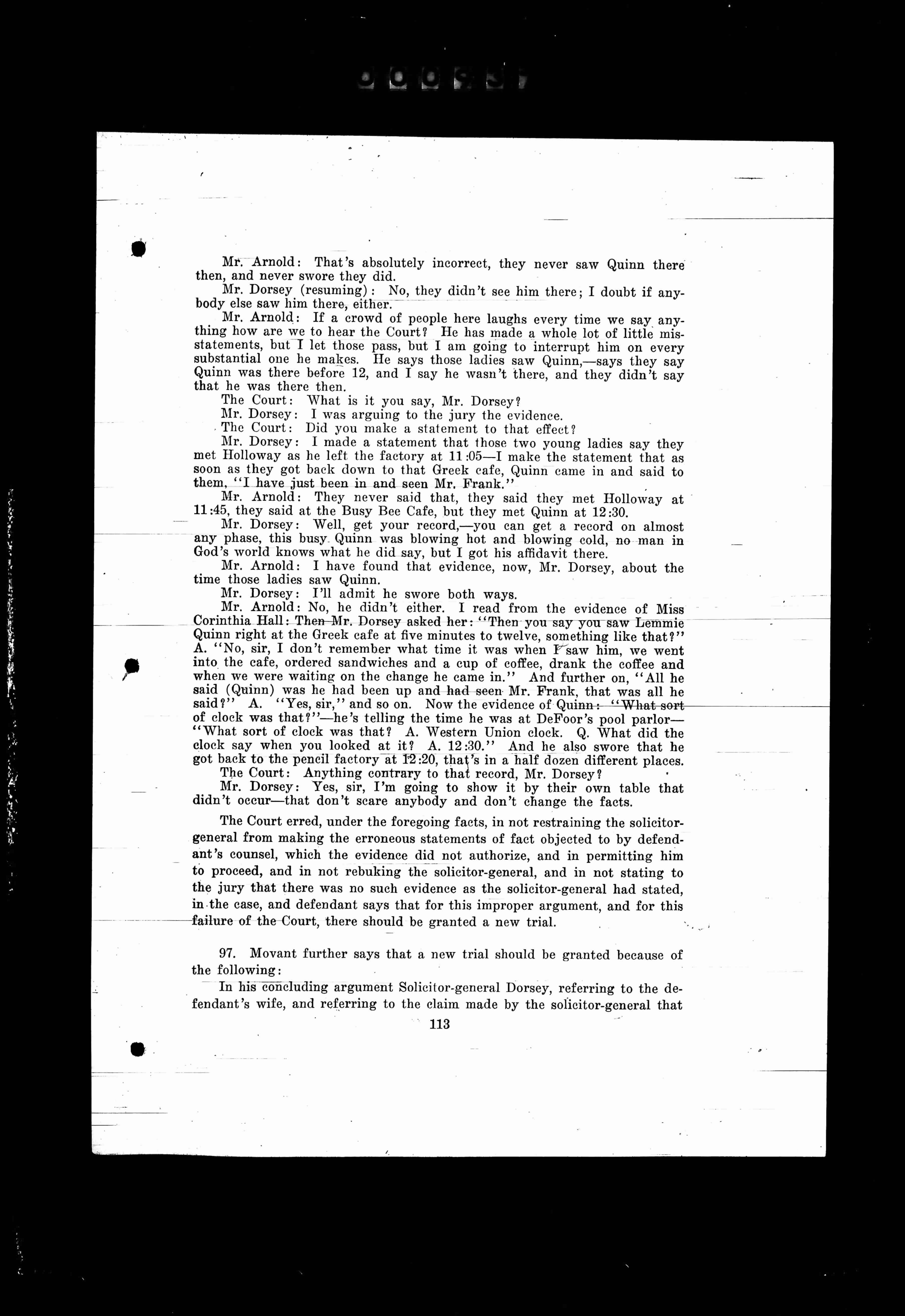 Mr. Dorsey: I made a statement that those two young ladies say they met Holloway as he left the factory at 11:05—I make the statement that as soon as they got back down to that Greek cafe, Quinn came in and said to them, "I have just been in and seen Mr. Frank."