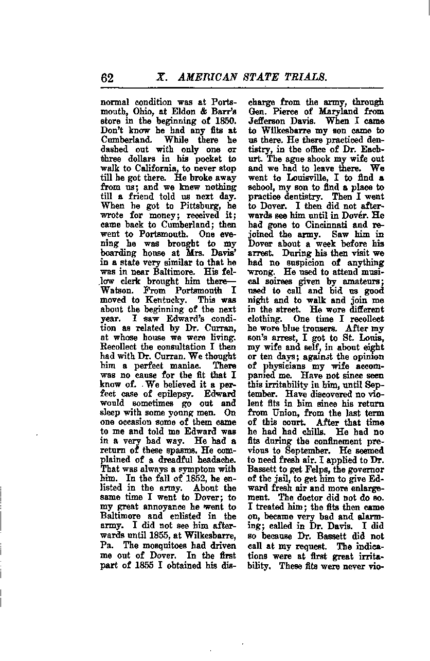 Edward's normal condition was at Portsmouth, Ohio, at Eldon & Barra's store in the beginning of 1850. I don’t know if he had any fits at Cumberland. While there, he dashed out with only one or three dollars in his pocket to walk to California, determined never to stop until he got there. He broke away from us, and we knew nothing until a friend told us the next day. When he got to Pittsburgh, he wrote for money; received it; came back to Cumberland; then went to Portsmouth. One evening, he was brought to my boarding house at Mrs. Davis’ in a state very similar to that he was in near Baltimore. His fellow clerk, Watson, brought him there. From Portsmouth, I moved to Kentucky. This was about the beginning of the next year. I saw Edward’s condition as related by Dr. Curran, at whose house we were living. I recall the consultation I then had with Dr. Curran. We thought him a perfect maniac. There was no cause for the fit that I know of. We believed it a perfect case of epilepsy. Edward would sometimes go out and sleep with some young men. On one occasion, some of them came to me and told me Edward was in a very bad way. He had a return of these spasms. He complained of a dreadful headache. That was always a symptom with him. In the fall of 1852, he enlisted in the army. About the same time, I went to Dover; to my great annoyance, he went to Baltimore and enlisted in the army. I did not see him afterwards until 1855, at Wilkes-Barre, PA. The mosquitoes had driven me out of Dover. In the first part of 1855, I obtained his discharge from the army, through Gen. Pierce of Maryland from Jefferson Davis. When I came to Wilkes-Barre, my son came to us there. He then practiced dentistry in the office of Dr. Eachurt. The ague shook my wife out, and we had to leave there. We went to Louisville, I to find a school, my son to find a place to practice dentistry. Then I went to Dover. I then did not see him afterwards until in Dover. He had gone to Cincinnati and rejoined the army. I saw him in Dover about a week before his arrest. During his then visit, we had no suspicion of anything wrong. He used to attend musical soirees given by amateurs; used to call and bid us good night and to walk and join me in the street. He wore different clothing. One time, I recollect he wore blue trousers. After my son's arrest, I got to St. Louis, my wife and self, in about eight or ten days; against the opinion of physicians, my wife accompanied me. I have not since seen this irritability in him, until September. I have discovered no violent fits in him since his return from Union, from the last term of this court. After that time, he had had chills. He had no fits during the confinement previous to September. He seemed to need fresh air. I applied to Dr. Bassett to get Felps, the governor of the jail, to give Edward fresh air and more enlargement. The doctor did not do so. I treated him; the fits then came on, became very bad and alarming; I called in Dr. Davis. I did so because Dr. Bassett did not call at my request. The indications were at first great irritability. These fits were never violent.