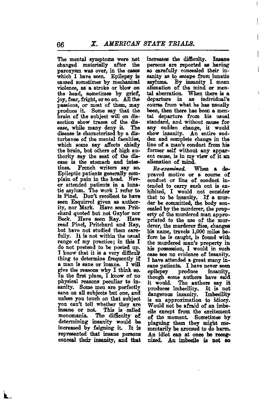 I have never attended patients in a lunatic asylum. The work I refer to is Pinel. I don’t recollect to have seen Esquirol given as authority, nor Marc. I have seen Pritchard quoted but not Gaylor nor Beck. I have seen Ray. I have read Pinel, Pritchard, and Ray, but have not studied them carefully. It is not within the usual range of my practice; in this, I do not pretend to be posted up. I know that it is a very difficult thing to determine frequently if a man is sane or insane. I will give the reasons why I think so.