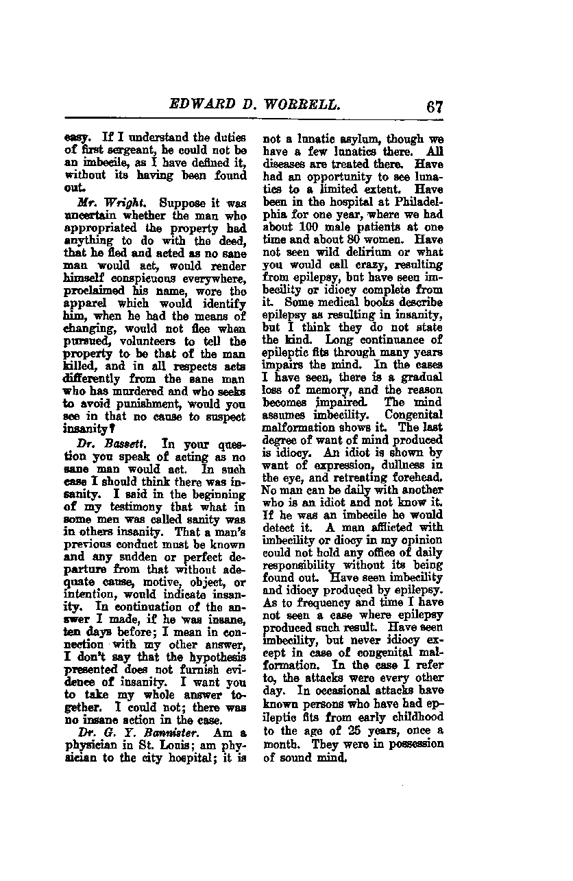Dr. G. Y. Bannister: I am a physician in St. Louis; I am a physician to the city hospital; it is not a lunatic asylum, though we have a few lunatics there. All diseases are treated there. I have had an opportunity to see lunatics to a limited extent. I have been in the hospital at Philadelphia for one year, where we had about 100 male patients at one time and about 80 women. I have not seen wild delirium or what you would call crazy, resulting from epilepsy, but I have seen imbecility or idiocy complete from it. Some medical books describe epilepsy as resulting in insanity, but I think they do not state the kind. Long continuance of epileptic fits through many years impairs the mind. In the cases I have seen, there is a gradual loss of memory, and the reason becomes impaired. The mind assumes imbecility. Congenital malformation shows it. The last degree of want of mind produced is idiocy. An idiot is shown by want of expression, dullness in the eye, and retreating forehead. No man can be daily with another who is an idiot and not know it. If he was an imbecile, he would detect it. A man afflicted with imbecility or idiocy, in my opinion, could not hold any office of daily responsibility without it being found out. I have seen imbecility and idiocy produced by epilepsy. As to frequency and time, I have not seen a case where epilepsy produced such a result. I have seen imbecility, but never idiocy except in the case of congenital malformation. In the case I refer to, the attacks were every other day. In occasional attacks, I have known persons who have had epileptic fits from early childhood to the age of 25 years, once a month. They were in possession of sound mind.