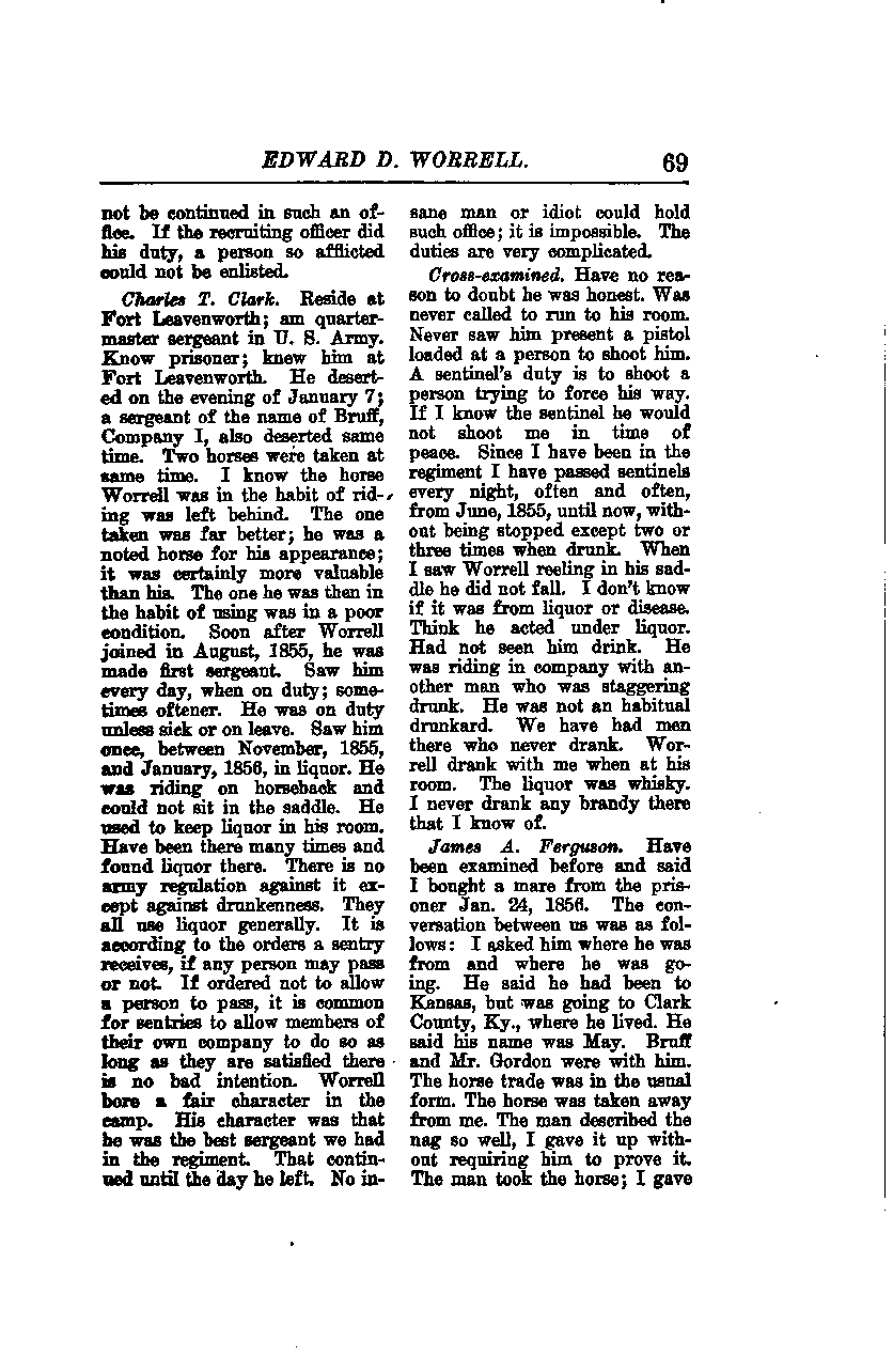 **Charles T. Clark.** I reside at Fort Leavenworth and am a quartermaster sergeant in the U.S. Army. I know the prisoner and knew him at Fort Leavenworth. He deserted on the evening of January 7, 1856. A sergeant named Bruff from Company I also deserted at the same time. Two horses were taken at the same time. I know the horse Worrell was in the habit of riding was left behind. The one taken was far better; it was a noted horse for its appearance and certainly more valuable than his. The one he was then in the habit of using was in poor condition. Soon after Worrell joined in August 1855, he was made first sergeant. I saw him every day when on duty, sometimes more often. He was on duty unless sick or on leave. I saw him once between November 1855 and January 1856, in liquor. He was riding on horseback and could not sit in the saddle. He used to keep liquor in his room. I have been there many times and found liquor there. There is no army regulation against it except against drunkenness. They all use liquor generally. It is according to the orders a sentry receives if any person may pass or not. If ordered not to allow a person to pass, it is common for sentries to allow members of their own company to do so as long as they are satisfied there is no bad intention. Worrell bore a fair character in the camp. His character was that he was the best sergeant we had in the regiment. That continued until the day he left. No insane man or idiot could hold such an office; it is impossible. The duties are very complicated.