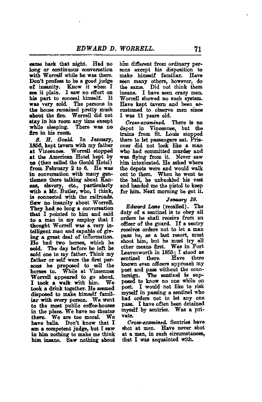 In January 1856, I kept a tavern with my father at Vincennes. Worrell stopped at the American Hotel, which we kept and was then called the Gould Hotel, from February 2 to 6. He was in conversation with many gentlemen there, talking about Kansas, slavery, etc., particularly with a Mr. Butler, who, I think, is connected with the railroads. I saw no insanity about Worrell. They had such a long conversation that I pointed to him and said to a man in my employ that I thought Worrell was a very intelligent man and capable of giving a great deal of information.