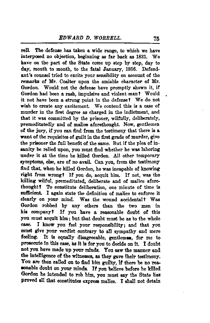 The defense has taken a wide range, to which we have interposed no objection, beginning as far back as 1831. We have, on the part of the State, come up step by step, day to day, month to month, to the fatal January of 1856. The defendant's counsel tried to excite your sensibility on account of the remarks of Mr. Coalter upon the amiable character of Mr. Gordon. Would not the defense have promptly shown it if Gordon had been a rash, impulsive, and violent man? Would it not have been a strong point in the defense? We do not wish to create any excitement. We contend that this is a case of murder in the first degree, as charged in the indictment, and that it was committed by the prisoner, willfully, deliberately, premeditatedly, and of malice aforethought.