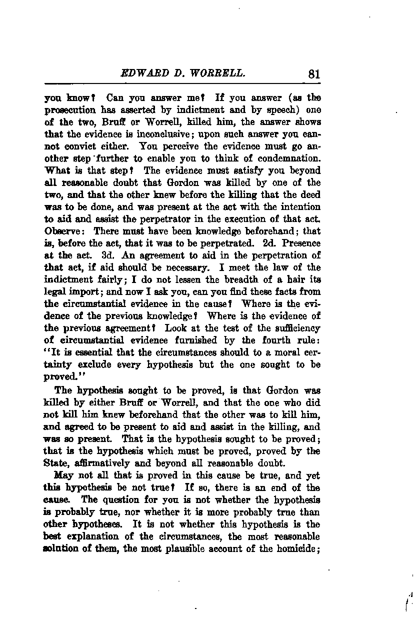 May not all that is proved in this case be true, and yet this hypothesis be not true? If so, there is an end of the case. The question for you is not whether the hypothesis is probably true, nor whether it is more probably true than other hypotheses. It is not whether this hypothesis is the best explanation of the circumstances, the most reasonable solution of them, the most plausible account of the homicide.