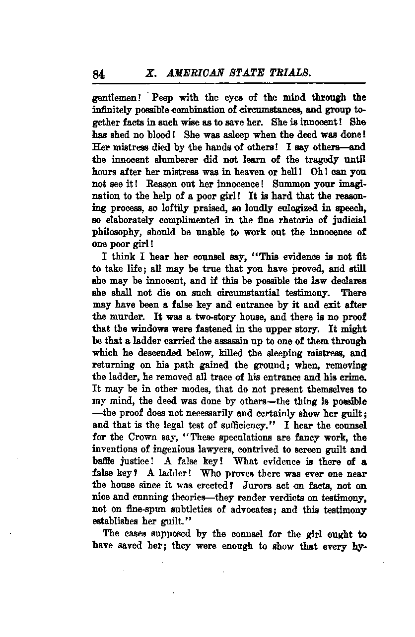 I think I hear her counsel say, "This evidence is not fit to take life; all may be true that you have proved, and still she may be innocent, and if this be possible, the law declares she shall not die on such circumstantial testimony. There may have been a false key and entrance by it and exit after the murder. It was a two-story house, and there is no proof that the windows were fastened in the upper story. It might be that a ladder carried the assassin up to one of them through which he descended below, killed the sleeping mistress, and returning on his path gained the ground; when, removing the ladder, he removed all trace of his entrance and his crime. It may be in other modes, that do not present themselves to my mind, the deed was done by others—the thing is possible—the proof does not necessarily and certainly show her guilt; and that is the legal test of sufficiency." I hear the counsel for the Crown say, "These speculations are fancy work, the inventions of ingenious lawyers, contrived to screen guilt and baffle justice! A false key! What evidence is there of a false key? A ladder! Who proves there was ever one near the house since it was erected? Jurors act on facts, not on nice and cunning theories—they render verdicts on testimony, not on fine-spun subtleties of advocates; and this testimony establishes her guilt."
