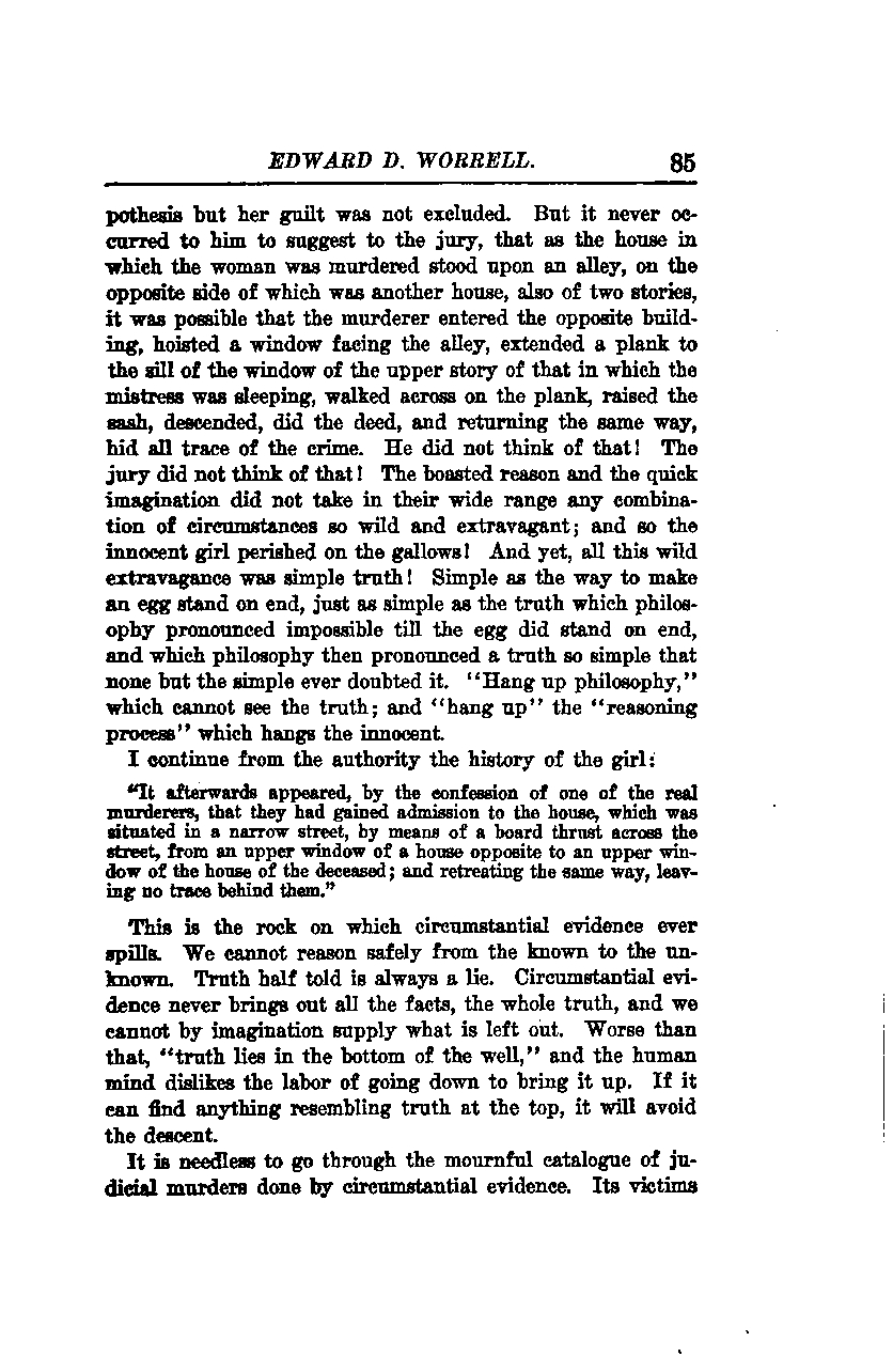 It was hypothesized that she was guilty, but her guilt was not excluded. However, it never occurred to him to suggest to the jury that, as the house in which the woman was murdered stood upon an alley, on the opposite side of which was another house, also of two stories, it was possible that the murderer entered the opposite building, hoisted a window facing the alley, extended a plank to the sill of the window of the upper story of that in which the mistress was sleeping, walked across on the plank, raised the sash, descended, did the deed, and returning the same way, hid all trace of the crime. He did not think of that! The jury did not think of that! The boasted reason and the quick imagination did not take in their wide range any combination of circumstances so wild and extravagant; and so the innocent girl perished on the gallows! And yet, all this wild extravagance was simple truth! Simple as the way to make an egg stand on end, just as simple as the truth which philosophy pronounced impossible until the egg did stand on end, and which philosophy then pronounced a truth so simple that none but the simple ever doubted it. "Hang up philosophy," which cannot see the truth; and "hang up" the "reasoning process" which hangs the innocent.