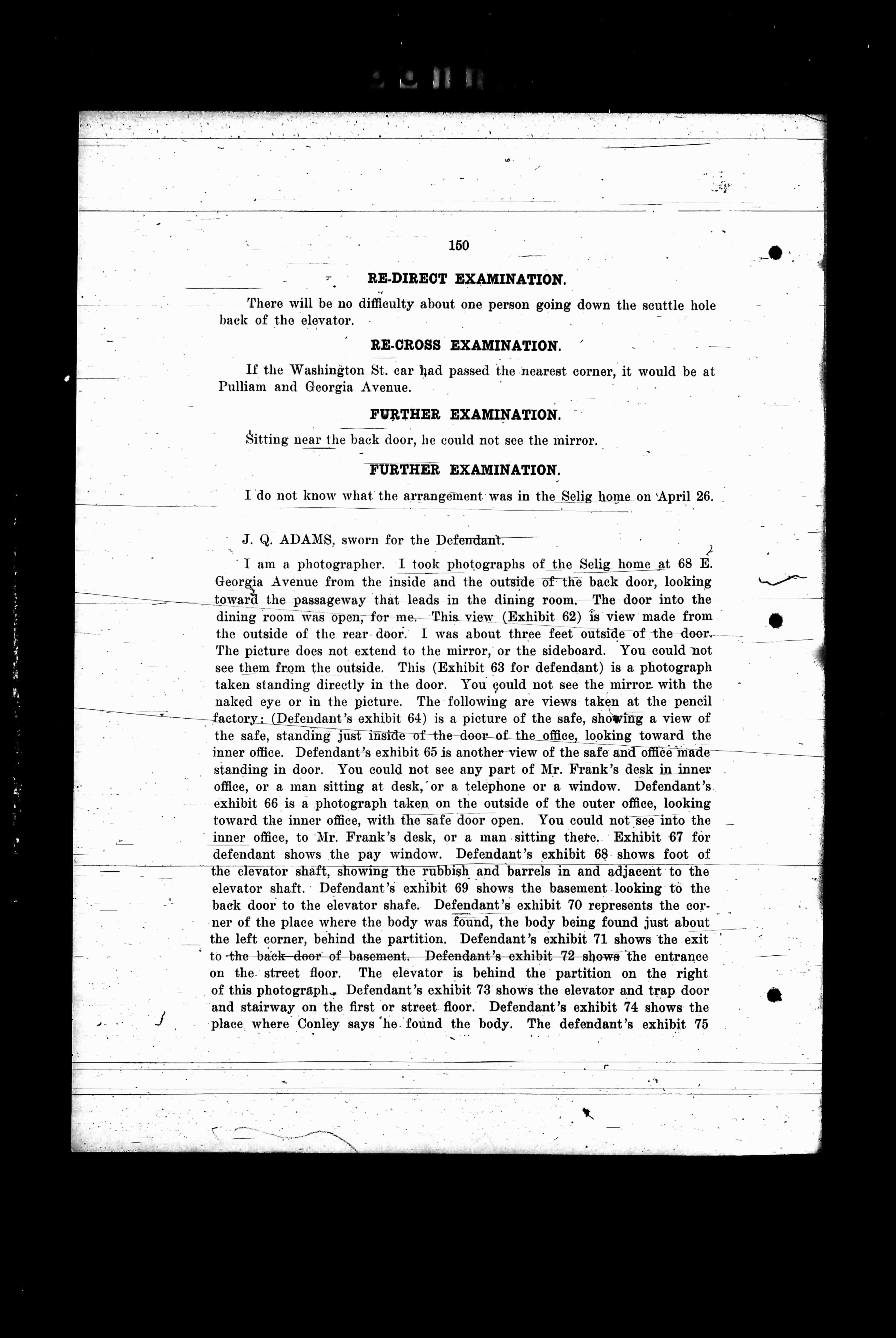 I am a photographer. I took photographs of the Selig home at 68 E. Georgia Avenue from the inside and the outside of the back door, looking toward the passageway that leads in the dining room. The door into the dining room was open, for me. This view (Exhibit 62) is view made from the outside of the rear door. I was about three feet outside of the door. The picture does not extend to the mirror, or the sideboard. You could not see them from the outside. This (Exhibit 63 for defendant) is a photograph taken standing directly in the door. You could not see the mirror with the naked eye or in the picture. The following are views taken at the pencil factory: (Defendant's exhibit 64) is a picture of the safe, showing a view of the safe, standing just inside of the door of the office, looking toward the inner office. Defendant's exhibit 65 is another view of the safe and office made standing in door. You could not see any part of Mr. Frank's desk in inner office, or a man sitting at desk, or a telephone or a window. Defendant's exhibit 66 is a photograph taken on the outside of the outer office, looking toward the inner office, with the safe open. You could not see into the inner office, to Mr. Frank's desk, or one sitting there. Exhibit 67 for defendant shows the pay window. Defendant's exhibit 68 shows foot of the elevator shaft, showing the rubbish and barrels in and adjacent to the elevator shaft. Defendant's exhibit 69 shows the basement looking to the back door to the elevator shaft. Defendant's exhibit 70 represents the corner of the place where the body was found, the body being found just about the left corner, behind the partition. Defendant's exhibit 71 shows the exit to the back door of basement. Defendant's exhibit 72 shows the entrance on the street floor. The elevator is behind the partition on the right of this photograph. Defendant's exhibit 73 shows the elevator and trap door and stairway on the first or street floor. Defendant's exhibit 74 shows the place where Conley says he found the body. The defendant's exhibit 75