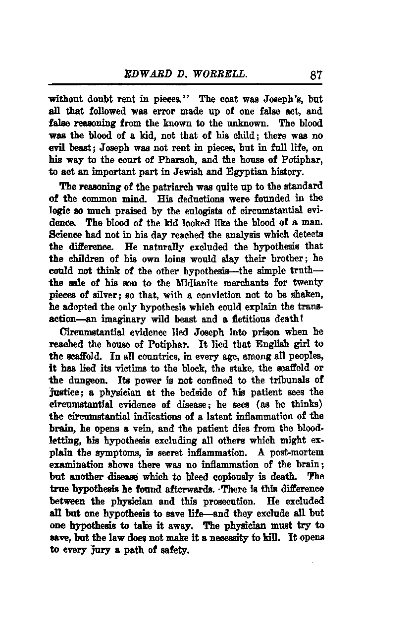 Circumstantial evidence led Joseph into prison when he reached the house of Potiphar. It led that English girl to the scaffold. In all countries, in every age, among all peoples, it has led its victims to the block, the stake, the scaffold, or the dungeon. Its power is not confined to the tribunals of justice; a physician at the bedside of his patient sees the circumstantial evidence of disease; he sees (as he thinks) the circumstantial indications of a latent inflammation of the brain, he opens a vein, and the patient dies from the bloodletting. His hypothesis, excluding all others which might explain the symptoms, is secret inflammation. A post-mortem examination shows there was no inflammation of the brain, but another disease for which to bleed copiously is death. The true hypothesis he found afterwards. There is this difference between the physician and this prosecution: he excluded all but one hypothesis to save life—and they exclude all but one hypothesis to take it away. The physician must try to save, but the law does not make it a necessity to kill. It opens to every jury a path of safety.
