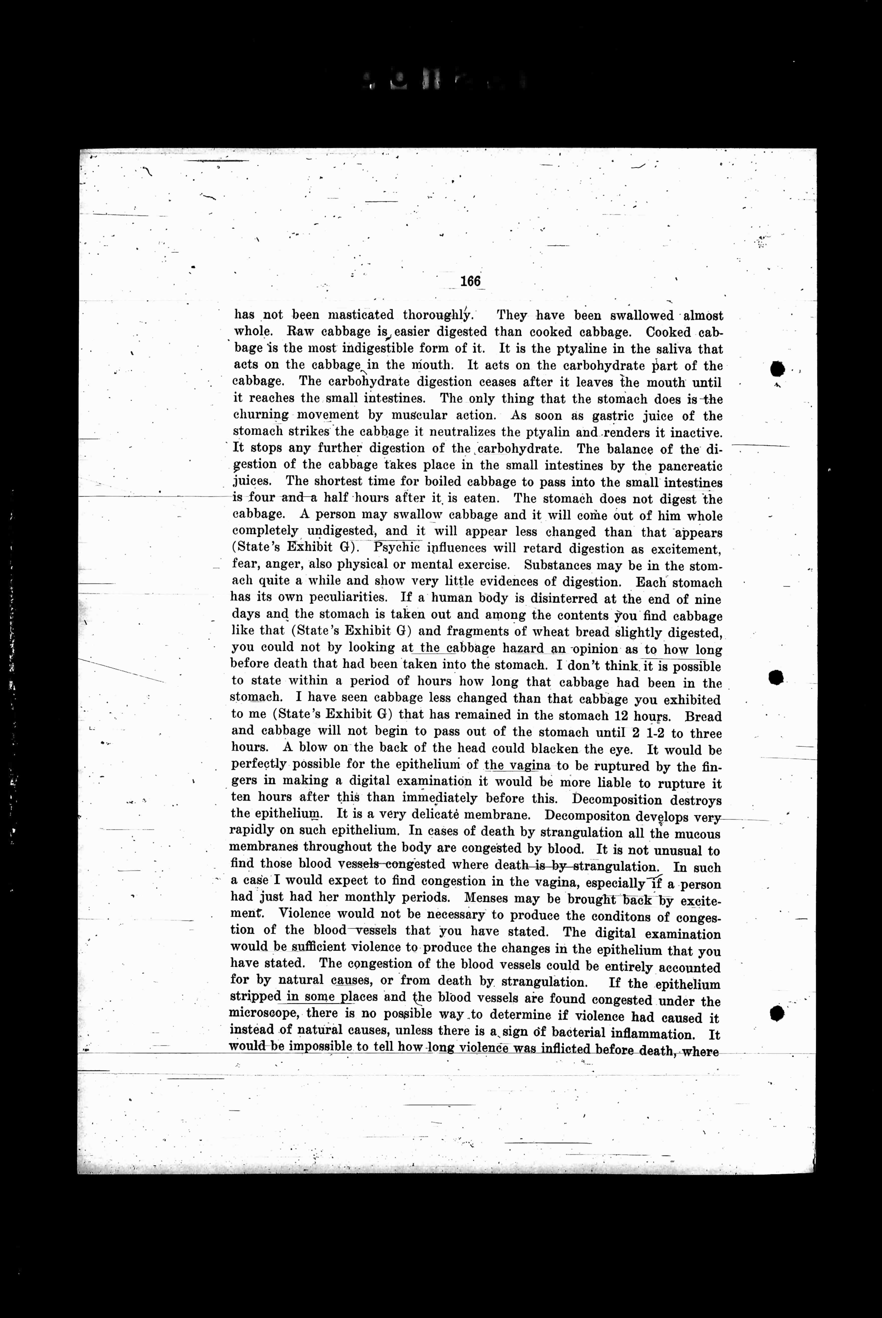 has not been masticated thoroughly. They have been swallowed almost whole. Raw cabbage is easier digested than cooked cabbage. Cooked cabbage is the most indigestible form of it. It is the ptyaline in the saliva that acts on the cabbage in the mouth. Action on the carbohydrate part of the cabbage. The carbohydrate digestion ceases after that leaves the mouth until it reaches the small intestines. The only thing that the stomach does is the churning movement by muscular action. As soon as gastric juice of the stomach strikes the cabbage it neutralizes the ptyalin and renders it inactive. It stops any further digestion of the carbohydrate. The balance of the digestion of the cabbage takes place in the small intestines by the pancreatic juices. The shortest time for boiled cabbage to pass into the small intestines is four and a half hours after it is eaten. The stomach does not digest the cabbage. A person may swallow cabbage and it will come out of him whole completely undigested, and it will appear less changed than that appears (State's Exhibit G). Psychic influences will retard digestion as excitement, fear, anger, also physical or mental exercise. Substances may be in the stomach quite a while and show very little evidences of digestion. Each stomach has its own peculiarities. If a human body is disinterred at the end of nine days and the stomach is taken out and among the contents you find cabbage like that (State's Exhibit G) and fragments of wheat bread slightly digested, you could not say by looking at the cabbage hazard an opinion as to how long before death that had been taken into the stomach. I don't think it is possible to state within a period of hours how long that cabbage had been in the stomach. I have seen cabbage less changed than that cabbage you exhibited to me (State's Exhibit G) that had remained in the stomach 12 hours. Bread and cabbage will not begin to pass out of the stomach until 2 to 3 hours. A blow on the back of the head could blacken the eye. It would be perfectly possible for the epithelium of the vagina to be ruptured by the fingers in making a digital examination. It would be more liable to rupture it ten hours after this than immediately before this. Decomposition destroys the epithelium. It is a very delicate membrane. Decomposition develops very rapidly on such epithelium. In cases of death by strangulation all the mucous membranes throughout the body are congested by blood. It is not unusual to find those blood vessels-congested where death-is-by-strangulation. In such a case I would expect to find congestion in the vagina, especially if a person had just had her monthly periods. Menses may be brought back by excitement. Violence would not be necessary to produce the conditions of congestion of the blood-vessels that you have stated. The digital examination would be sufficient violence to produce the changes in the epithelium that you have stated. The congestion of the blood vessels could be entirely accounted for by natural causes, or from death by strangulation. If the epithelium stripped in some places and the blood vessels are found congested under the microscope, there is no possible way to determine if violence had caused it instead of natural causes, unless there is a sign of bacterial inflammation. It would be impossible to tell how long violence was inflicted before death, where