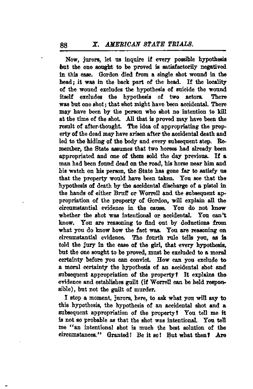Now, jurors, let us inquire if every possible hypothesis but the one sought to be proved is satisfactorily negated in this case. Gordon died from a single gunshot wound in the head; it was in the back part of the head. If the location of the wound excludes the hypothesis of suicide, the wound itself excludes the hypothesis of two actors. There was but one shot; that shot might have been accidental. There may have been no intention to kill by the person who shot at the time of the shot. All that is proved may have been the result of afterthought. The idea of appropriating the property of the dead may have arisen after the accidental death and led to the hiding of the body and every subsequent step. Remember, the State assumes that two horses had already been appropriated and one of them sold the day before. If a man had been found dead on the road, his horse near him and his watch on his person, the State has gone far to satisfy us that the property would have been taken. You see that the hypothesis of death by the accidental discharge of a pistol in the hands of either Bruff or Worrell and the subsequent appropriation of Gordon's property will explain all the circumstantial evidence in the case. You do not know whether the shot was intentional or accidental. You can't know. You are reasoning to find out by deductions from what you do know how the fact was. You are reasoning on circumstantial evidence. The fourth rule tells you, as is told the jury in the case of the girl, that every hypothesis but the one sought to be proved must be excluded to a moral certainty before you can convict. How can you exclude to a moral certainty the hypothesis of an accidental shot and subsequent appropriation of the property? It explains the evidence and establishes guilt (if Worrell can be held responsible), but not the guilt of murder.
