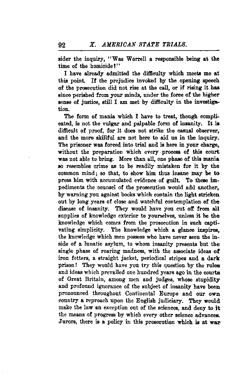 They would have you try this question by the rules and ideas that prevailed one hundred years ago in the courts of Great Britain, among men and judges whose stupidity and profound ignorance of the subject of insanity have been pronounced throughout Continental Europe and our own country as a reproach upon the English judiciary. They would make the law an exception out of the sciences and deny to it the means of progress by which every other science advances. Jurors, there is a policy in this prosecution which is at war with the principles of justice and enlightenment.