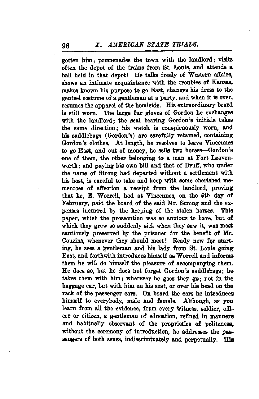 Ready now for starting, he sees a gentleman and his lady from St. Louis going East, and forthwith introduces himself as Worrell and informs them he will do himself the pleasure of accompanying them. He does so, but he does not forget Gordon's saddlebags; he takes them with him; wherever he goes, they go; not in the baggage car, but with him on his seat, or over his head on the rack of the passenger cars. On board the cars, he introduces himself to everybody, male and female. Although, as you learn from all the evidence, from every witness, soldier, officer, or citizen, a gentleman of education, refined in manners and habitually observant of the proprieties of politeness, without the ceremony of introduction, he addresses the passengers of both sexes, indiscriminately and perpetually.