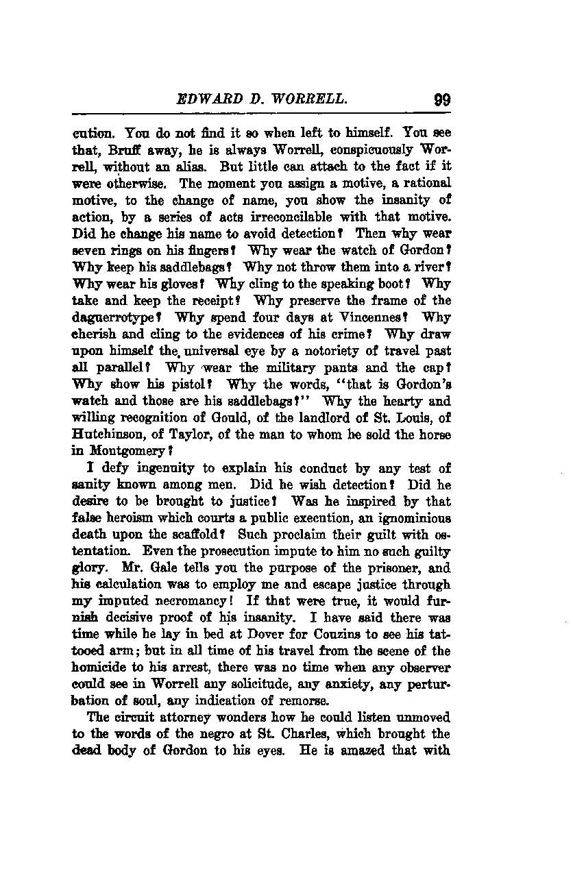 I defy ingenuity to explain his conduct by any test of sanity known among men. Did he wish for detection? Did he desire to be brought to justice? Was he inspired by that false heroism which courts a public execution, an ignominious death upon the scaffold? Such individuals proclaim their guilt with ostentation. Even the prosecution does not impute to him such guilty glory. Mr. Gale tells you that the prisoner's purpose, and his calculation, was to employ me and escape justice through my imputed necromancy! If that were true, it would furnish decisive proof of his insanity. I have said there was time while he lay in bed at Dover for Couzins to see his tattooed arm; but in all the time of his travel from the scene of the homicide to his arrest, there was no time when any observer could see in Worrell any solicitude, any anxiety, any perturbation of soul, or any indication of remorse.