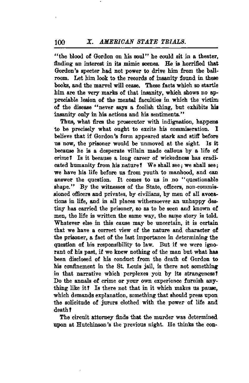 Thus, what fires the prosecutor with indignation happens to be precisely what ought to excite his commiseration. I believe that if Gordon's form appeared stark and stiff before us now, the prisoner would be unmoved at the sight. Is it because he is a desperate villain made callous by a life of crime? Is it because a long career of wickedness has eradicated humanity from his nature? We shall see; we shall see; we have his life before us from youth to manhood, and can answer the question. It comes to us in no "questionable shape." By the witnesses of the State—officers, non-commissioned officers, and privates; by civilians; by men of all vocations in life, and in all places whithersoever an unhappy destiny has carried the prisoner, so as to be seen and known of men—the life is written the same way, the same story is told. Whatever else in this cause may be uncertain, it is certain that we have a correct view of the nature and character of the prisoner, a fact of the last importance in determining the question of his responsibility to law. But if we were ignorant of his past, if we knew nothing of the man but what has been disclosed of his conduct from the death of Gordon to his confinement in the St. Louis jail, is there not something in that narrative which perplexes you by its strangeness? Do the annals of crime or your own experience furnish anything like it? Is there not that in it which makes us pause, which demands explanation, something that should press upon the solicitude of jurors clothed with the power of life and death?