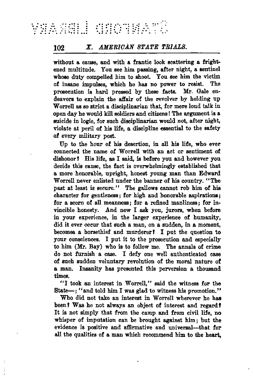 Up to the hour of his desertion, in all his life, who ever connected the name of Worrell with an act or sentiment of dishonor? His life, as I said, is before you, and however you decide this cause, the fact is overwhelmingly established that a more honorable, upright, honest young man than Edward Worrell never enlisted under the banner of his country. "The past at least is secure." The gallows cannot rob him of his character for gentleness; for high and honorable aspirations; for a scorn of all meanness; for a refined manliness; for invincible honesty. And now I ask you, jurors, when before in your experience, in the larger experience of humanity, did it ever occur that such a man, on a sudden, in a moment, becomes a horse thief and murderer? I put the question to your consciences. I put it to the prosecution and especially to him (Mr. Bay) who is to follow me. The annals of crime do not furnish a case. I defy one well-authenticated case of such sudden voluntary revolution of the moral nature of a man. Insanity has presented this perversion a thousand times.