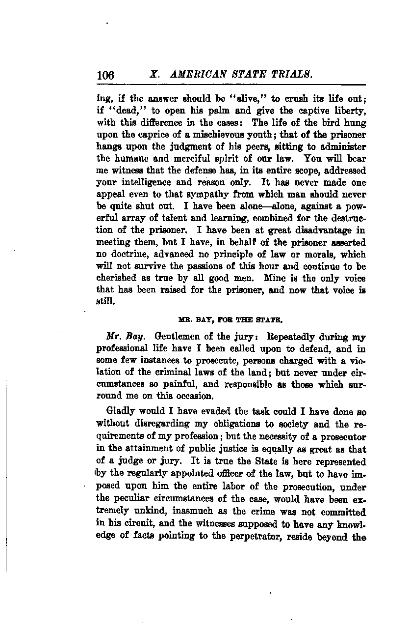Mr. Bay: Gentlemen of the jury, repeatedly during my professional life have I been called upon to defend, and in some few instances to prosecute, persons charged with a violation of the criminal laws of the land; but never under circumstances so painful and responsible as those which surround me on this occasion.