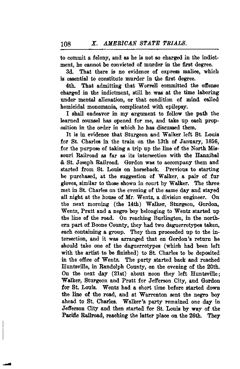 It is in evidence that Sturgeon and Walker left St. Louis for St. Charles on the train on the 13th of January, 1856, for the purpose of taking a trip up the line of the North Missouri Railroad as far as its intersection with the Hannibal & St. Joseph Railroad. Gordon was to accompany them and started from St. Louis on horseback. Previous to starting, he purchased, at the suggestion of Walker, a pair of fur gloves, similar to those shown in court by Walker. The three met in St. Charles on the evening of the same day and stayed all night at the house of Mr. Wentz, a division engineer.