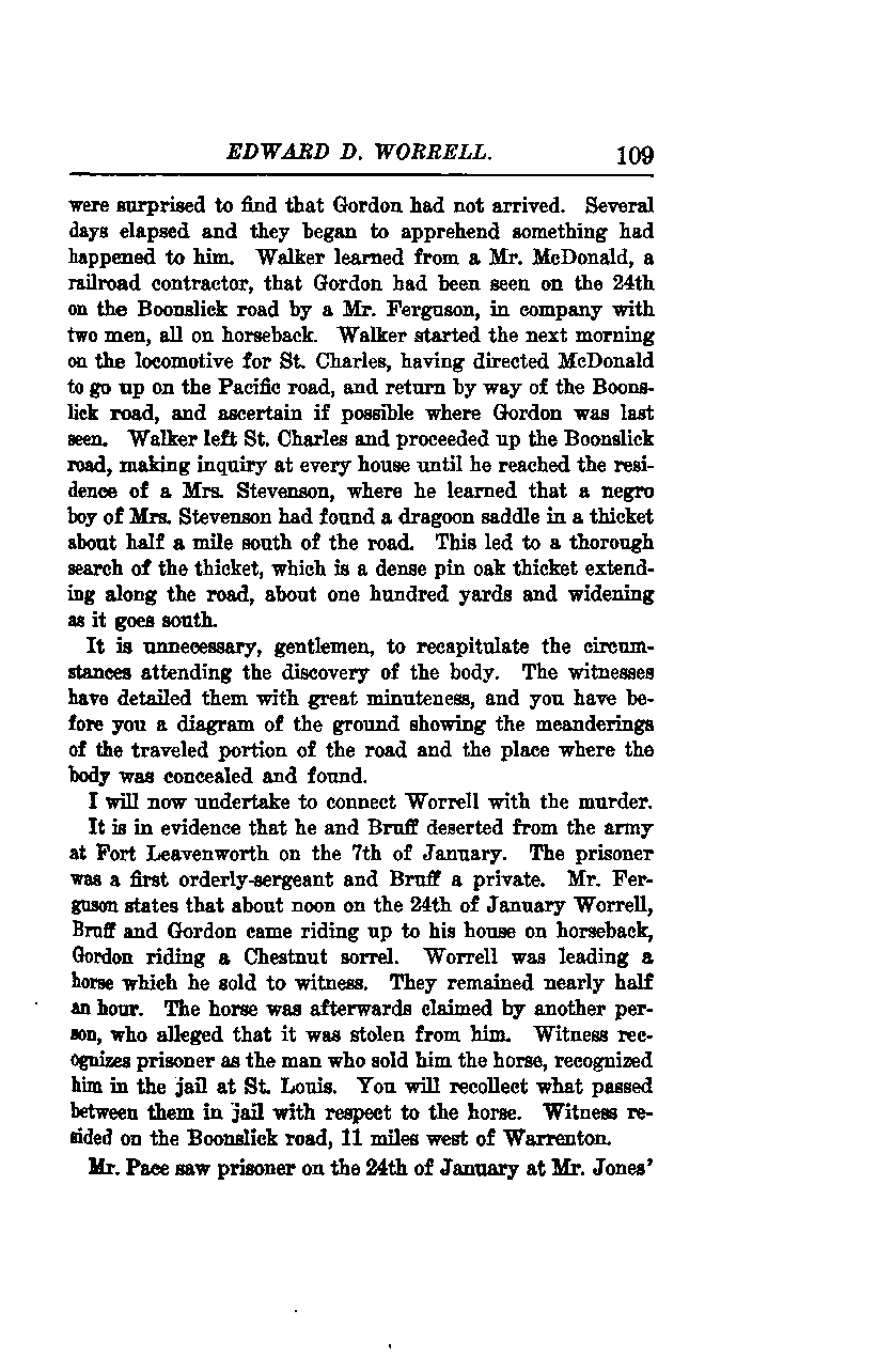 It is in evidence that he and Bruff deserted from the army at Fort Leavenworth on the 7th of January. The prisoner was a first orderly-sergeant and Bruff a private. Mr. Ferguson states that about noon on the 24th of January, Worrell, Bruff, and Gordon came riding up to his house on horseback, with Gordon riding a chestnut sorrel. Worrell was leading a horse which he sold to the witness. They remained nearly half an hour. The horse was afterwards claimed by another person, who alleged that it was stolen from him. The witness recognizes the prisoner as the man who sold him the horse and recognized him in the jail at St. Louis. You will recollect what passed between them in jail with respect to the horse. The witness resided on the Boonslick road, 11 miles west of Warrenton.