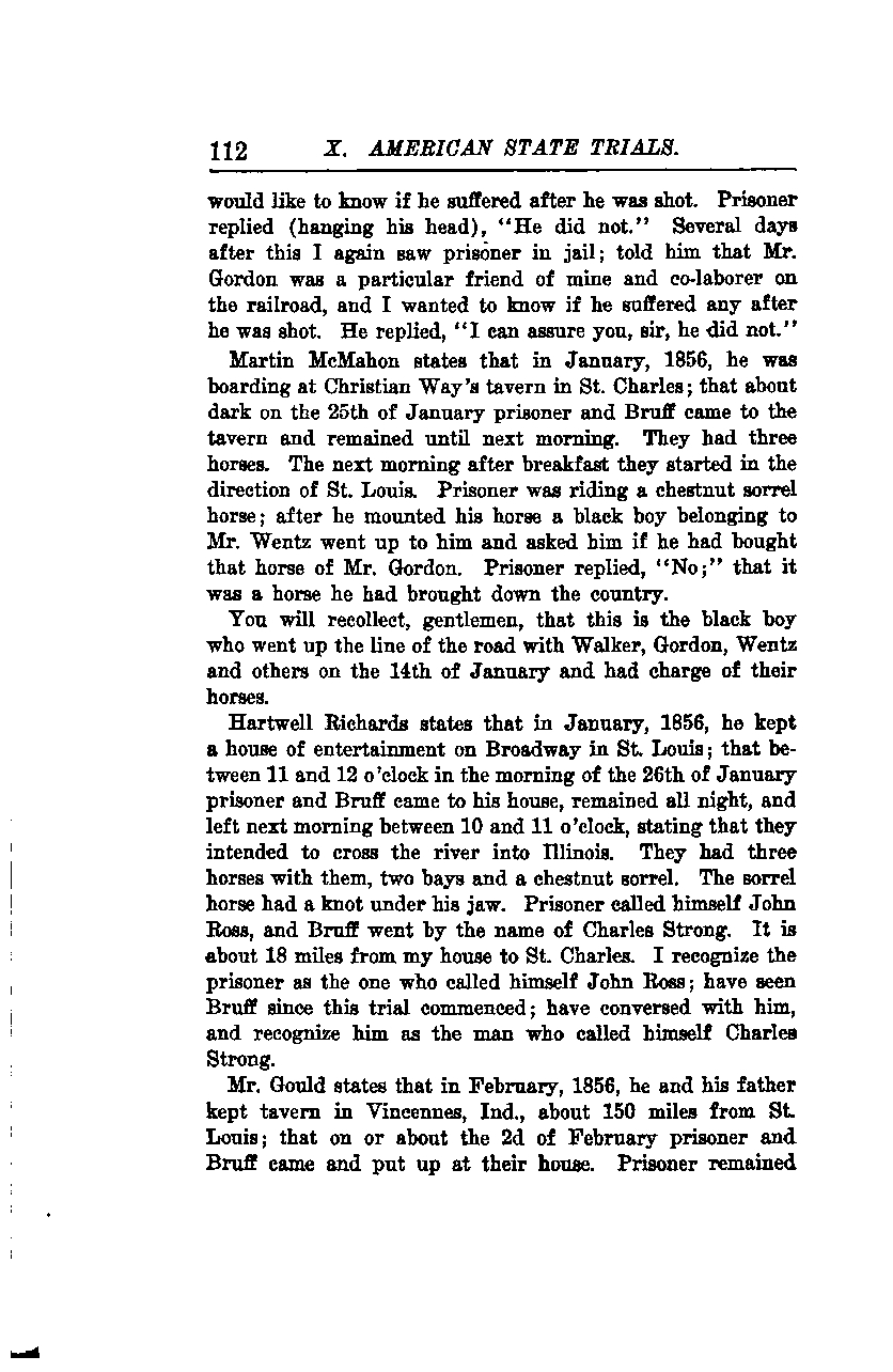 Martin McMahon states that in January 1856, he was boarding at Christian Way's tavern in St. Charles. About dark on the 25th of January, the prisoner and Bruff came to the tavern and remained until the next morning. They had three horses. The next morning, after breakfast, they started in the direction of St. Louis. The prisoner was riding a chestnut sorrel horse; after he mounted his horse, a black boy belonging to Mr. Wentz went up to him and asked if he had bought that horse from Mr. Gordon. The prisoner replied, "No;" that it was a horse he had brought down the country.