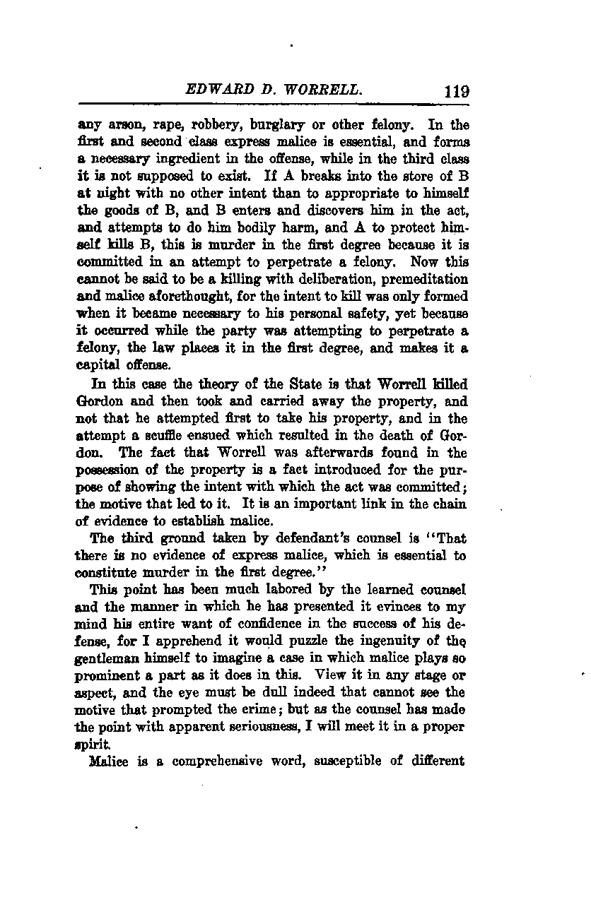 This point has been much labored by the learned counsel, and the manner in which he has presented it evinces to my mind his entire want of confidence in the success of his defense, for I apprehend it would puzzle the ingenuity of the gentleman himself to imagine a case in which malice plays so prominent a part as it does in this. View it in any stage or aspect, and the eye must be dull indeed that cannot see the motive that prompted the crime; but as the counsel has made the point with apparent seriousness, I will meet it in a proper spirit.