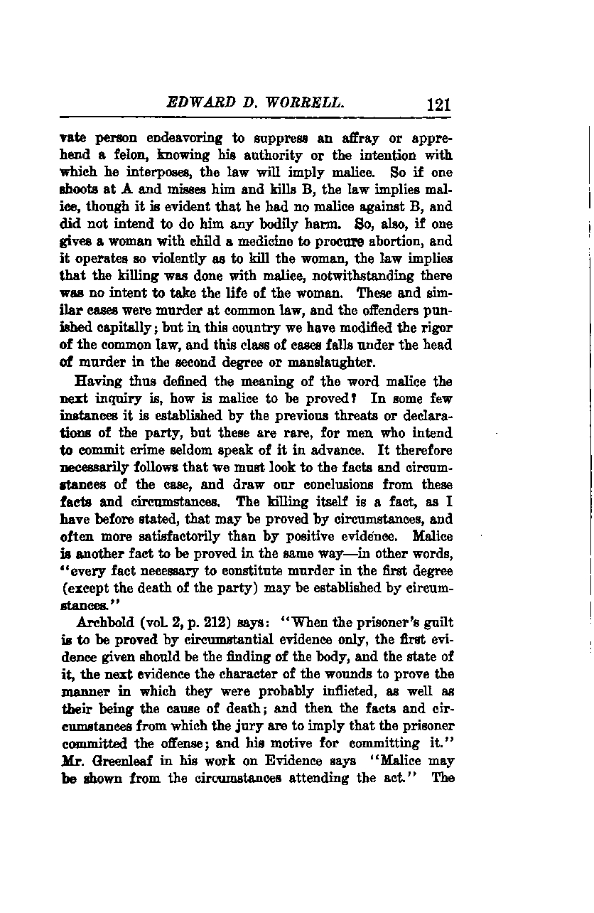 Archbold (vol. 2, p. 212) says: "When the prisoner's guilt is to be proved by circumstantial evidence only, the first evidence given should be the finding of the body, and the state of it; the next evidence, the character of the wounds to prove the manner in which they were probably inflicted, as well as their being the cause of death; and then the facts and circumstances from which the jury are to imply that the prisoner committed the offense, and his motive for committing it." Mr. Greenleaf, in his work on Evidence, says, "Malice may be shown from the circumstances attending the act."