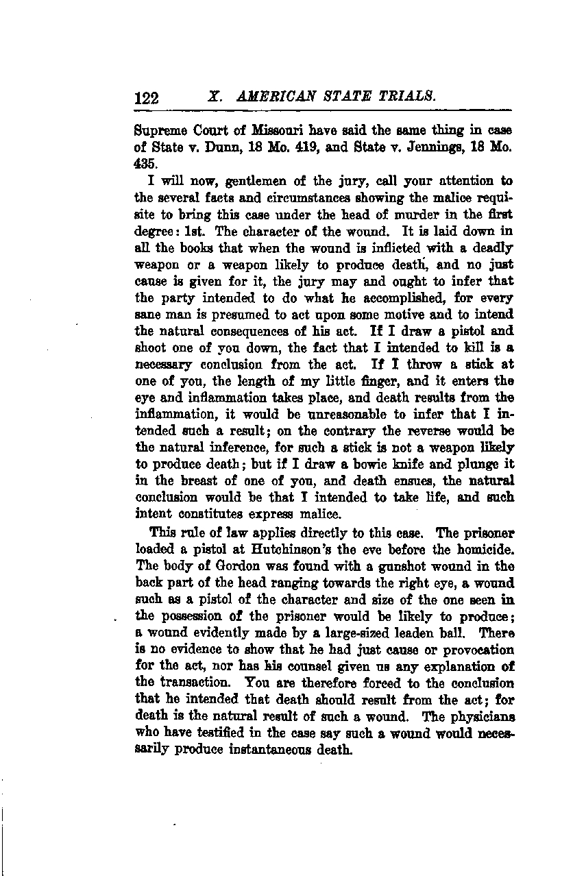 Gentlemen of the jury, I will now call your attention to the several facts and circumstances that demonstrate the malice requisite to classify this case as murder in the first degree. First, consider the character of the wound. It is established in all legal texts that when a wound is inflicted with a deadly weapon or a weapon likely to produce death, and no just cause is given for it, the jury may and ought to infer that the party intended to do what he accomplished. Every sane man is presumed to act upon some motive and to intend the natural consequences of his act. If I draw a pistol and shoot one of you down, the fact that I intended to kill is a necessary conclusion from the act. If I throw a stick at one of you, the length of my little finger, and it enters the eye, causing inflammation that results in death, it would be unreasonable to infer that I intended such a result; on the contrary, the reverse would be the natural inference, for such a stick is not a weapon likely to produce death. However, if I draw a bowie knife and plunge it into the breast of one of you, and death ensues, the natural conclusion would be that I intended to take life, and such intent constitutes express malice.