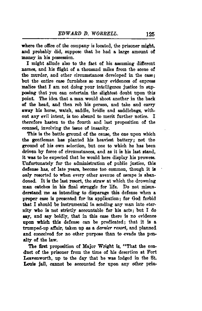 I might also allude to the fact of his assuming different names, and his flight of a thousand miles from the scene of the murder, and other circumstances developed in the case; but the entire case furnishes so many evidences of express malice that I am not doing your intelligence justice in supposing that you can entertain the slightest doubt upon this point. The idea that a man would shoot another in the back of the head, and then rob his person, and take and carry away his horse, watch, saddle, bridle, and saddlebags, without any evil intent, is too absurd to merit further notice. I therefore hasten to the fourth and last proposition of the counsel, involving the issue of insanity.