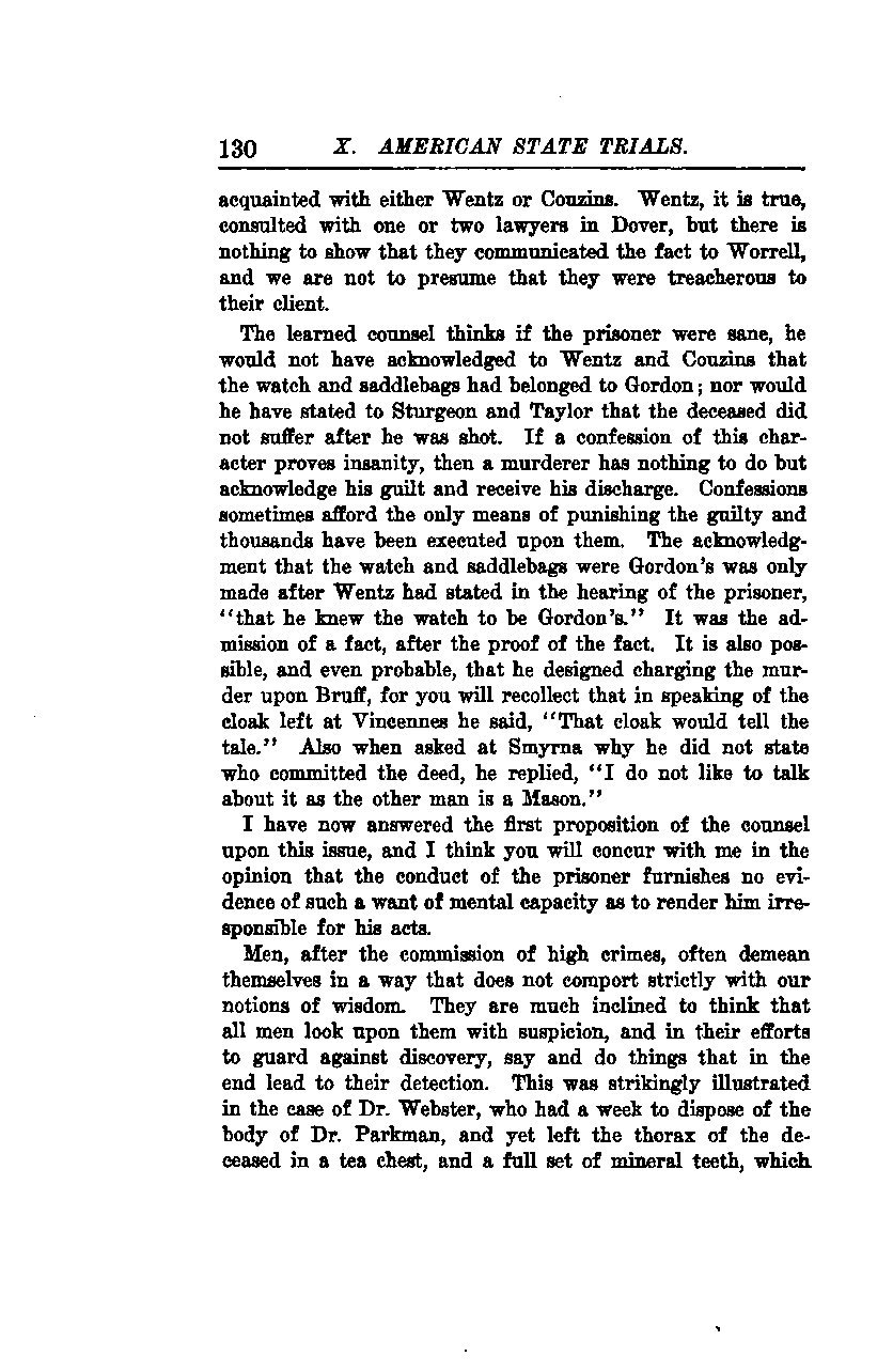 The learned counsel thinks that if the prisoner were sane, he would not have acknowledged to Wentz and Couzins that the watch and saddlebags had belonged to Gordon; nor would he have stated to Sturgeon and Taylor that the deceased did not suffer after he was shot. If a confession of this character proves insanity, then a murderer has nothing to do but acknowledge his guilt and receive his discharge. Confessions sometimes afford the only means of punishing the guilty, and thousands have been executed upon them. The acknowledgment that the watch and saddlebags were Gordon's was only made after Wentz had stated in the hearing of the prisoner, "that he knew the watch to be Gordon's." It was the admission of a fact, after the proof of the fact. It is also possible, and even probable, that he designed charging the murder upon Brnff, for you will recollect that in speaking of the cloak left at Vincennes he said, "That cloak would tell the tale." Also, when asked at Smyrna why he did not state who committed the deed, he replied, "I do not like to talk about it as the other man is a Mason."