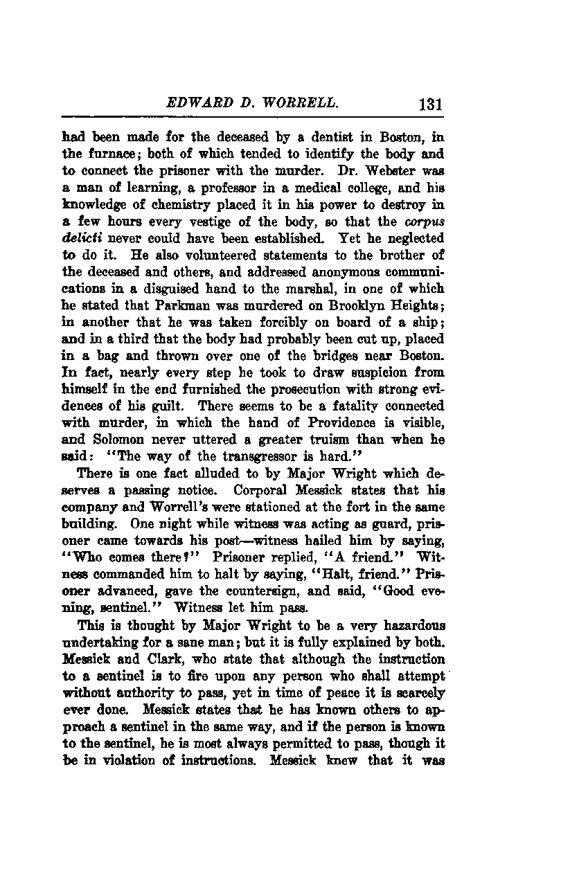 There is one fact alluded to by Major Wright which deserves a passing notice. Corporal Messick states that his company and Worrell's were stationed at the fort in the same building. One night, while witness was acting as guard, the prisoner came towards his post. The witness hailed him by saying, "Who comes there?" The prisoner replied, "A friend." The witness commanded him to halt by saying, "Halt, friend." The prisoner advanced, gave the countersign, and said, "Good evening, sentinel." The witness let him pass.