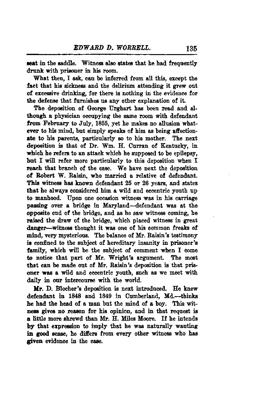 The deposition of George Urghart has been read. Although a physician occupying the same room with the defendant from February to July, 1855, he makes no allusion whatsoever to his mind but simply speaks of him as being affectionate to his parents, particularly so to his mother. The next deposition is that of Dr. Wm. H. Curran of Kentucky, in which he refers to an attack which he supposed to be epilepsy. I will refer more particularly to this deposition when I reach that branch of the case. We have next the deposition of Robert W. Raisin, who married a relative of the defendant. This witness has known the defendant for 25 or 26 years and states that he always considered him a wild and eccentric youth up to manhood. Upon one occasion, the witness was in his carriage passing over a bridge in Maryland when the defendant was at the opposite end of the bridge. As he saw the witness coming, he raised the draw of the bridge, which placed the witness in great danger. The witness thought it was one of his common freaks of mind, very mysterious. The balance of Mr. Raisin's testimony is confined to the subject of hereditary insanity in the prisoner's family, which will be the subject of comment when I come to notice that part of Mr. Wright's argument. The most that can be made out of Mr. Raisin's deposition is that the prisoner was a wild and eccentric youth, such as we meet with daily in our intercourse with the world.