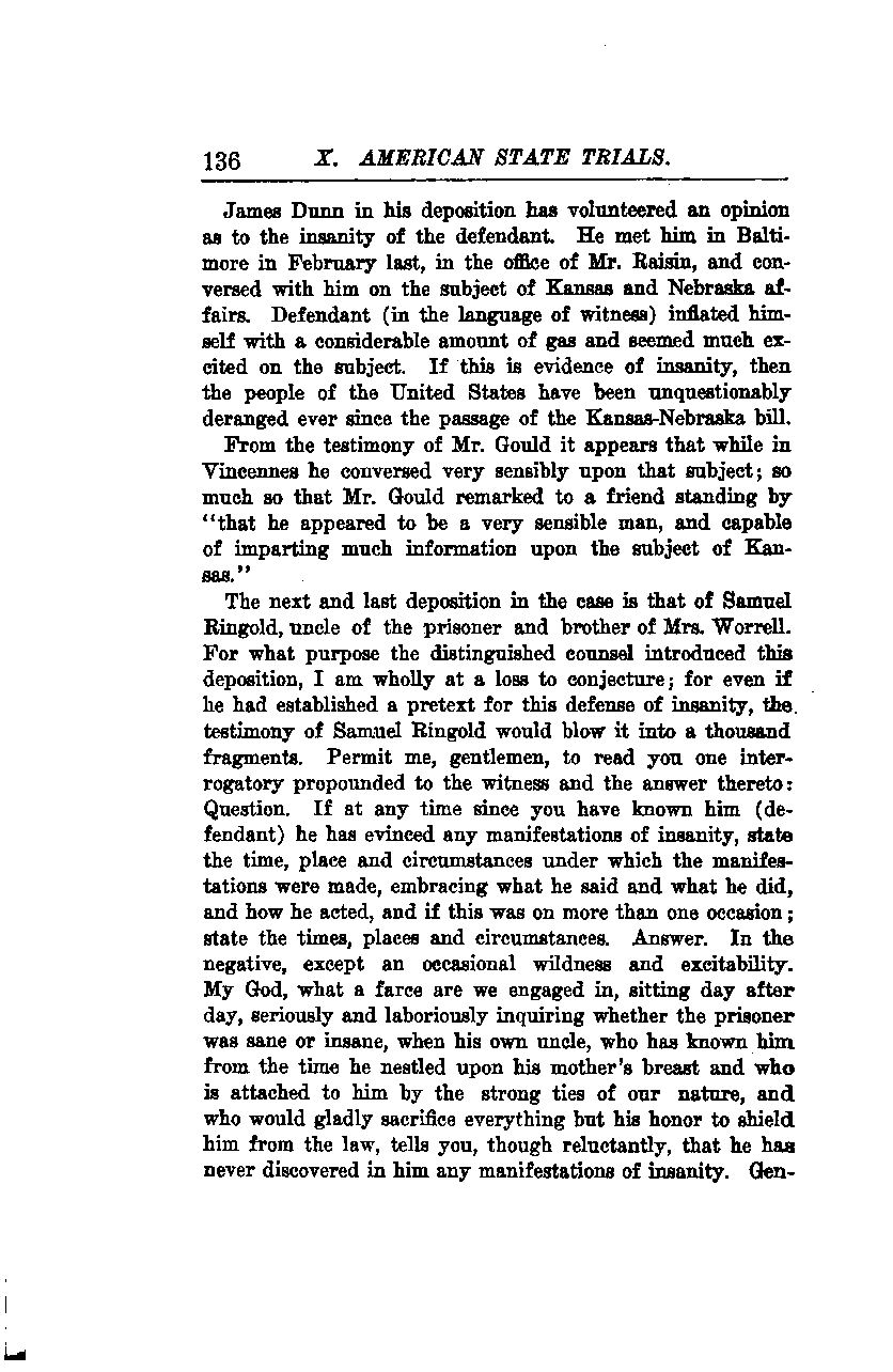 The next and last deposition in the case is that of Samuel Ringold, uncle of the prisoner and brother of Mrs. Worrell. For what purpose the distinguished counsel introduced this deposition, I am wholly at a loss to conjecture; for even if he had established a pretext for this defense of insanity, the testimony of Samuel Ringold would blow it into a thousand fragments. Permit me, gentlemen, to read you one interrogatory propounded to the witness and the answer thereto: